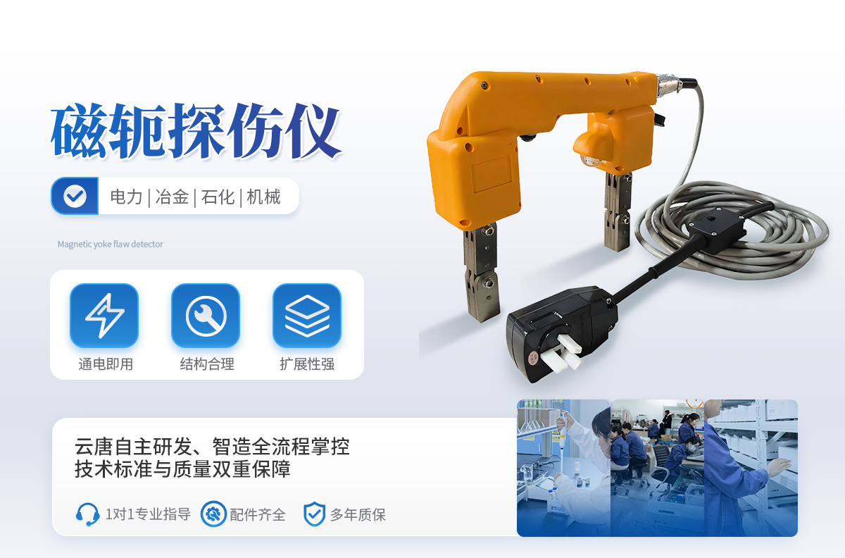 YT-CTS220C型電磁軛磁粉探傷儀,無主機設計,操作簡單方便,噪音小、重量輕、工作穩定。配直流磁化電源(鋰電),具有交流與直流磁化功能,適用于野外無電源現場操作以及高壓不能進入的容器、橋梁、管道等現場操作,一次充電連續工作時間可達6小時以上。交流供電電源采用~220V電源直接輸入,無需其他儀器配套,操作方便、簡單、重量輕、便于攜帶,因而該儀器得到廣泛使用。