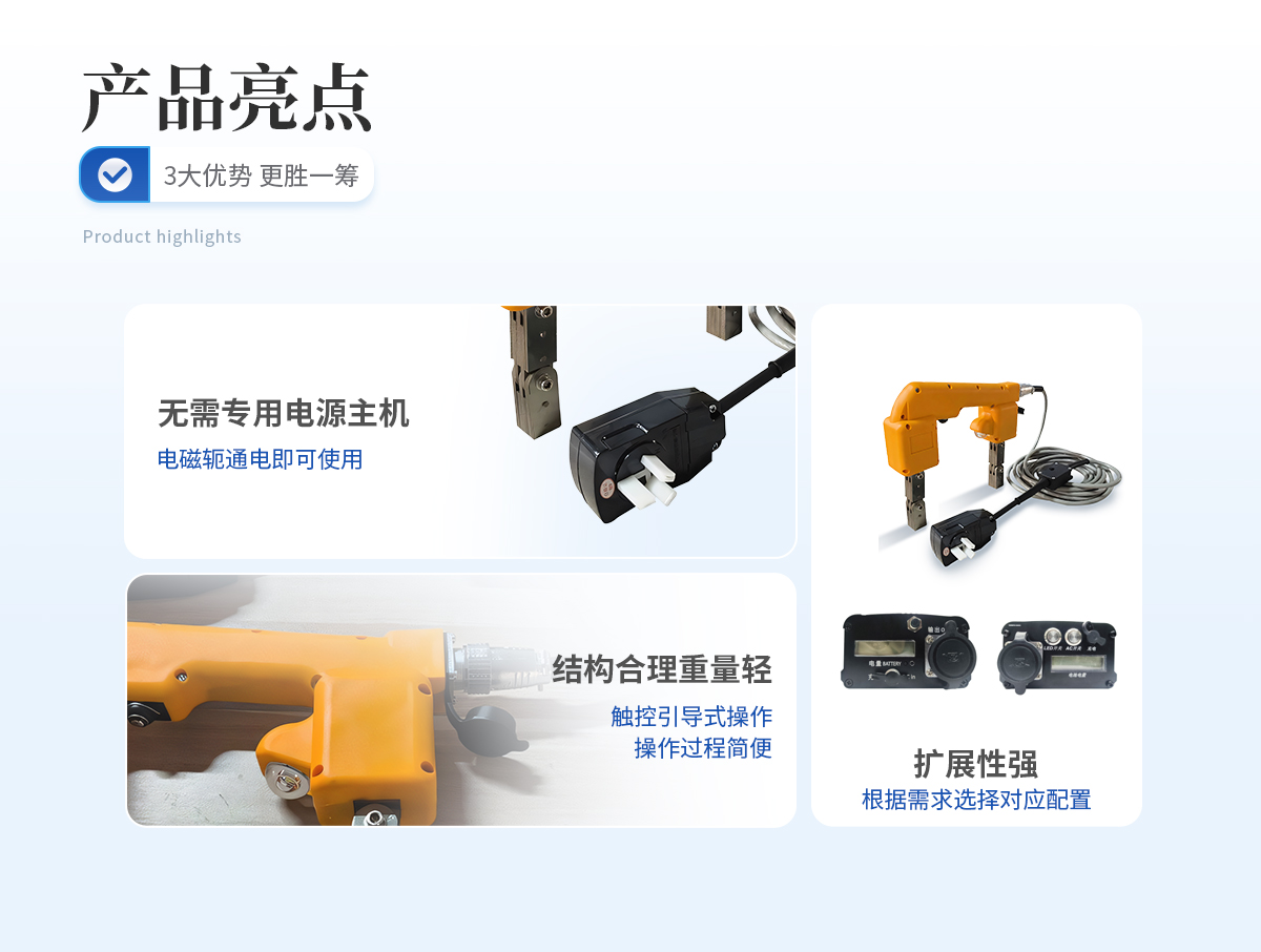 | 1、 無需專用電源主機,電磁軛通電即可使用; | 2、 體積小巧,重量輕; | 3、 開模制作,結構合理,手感舒適; | 4、 磁軛標配白光燈,可選熒光燈(不額外加費用); | 5、 配專用儀器箱; | 6、 擴展性強,可根據需要增配對應的專用電池包,通過專用電源來實現交流、直流磁化功能。可滿足不方便拖電源線的場所使用。 |