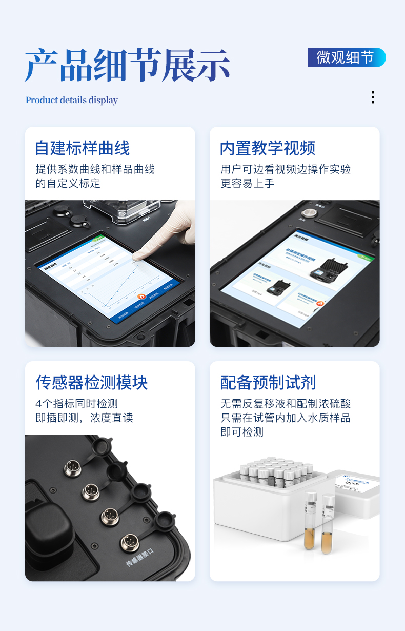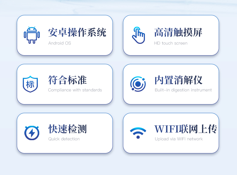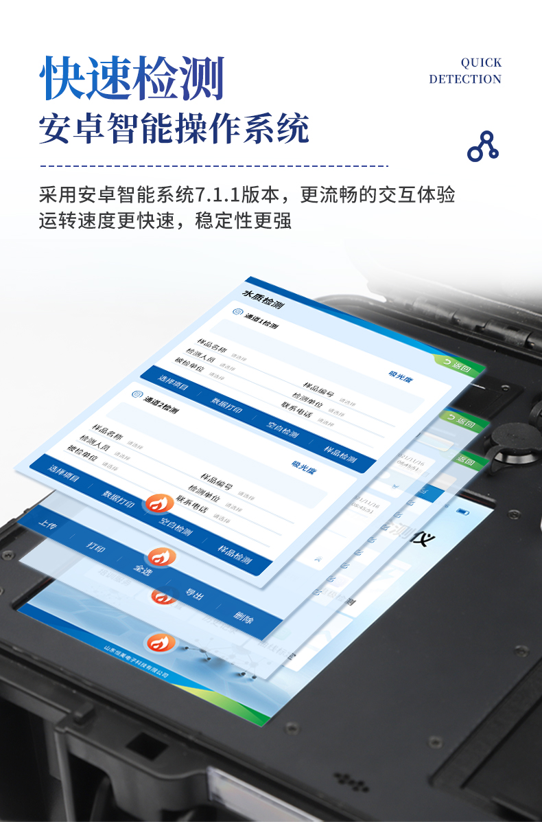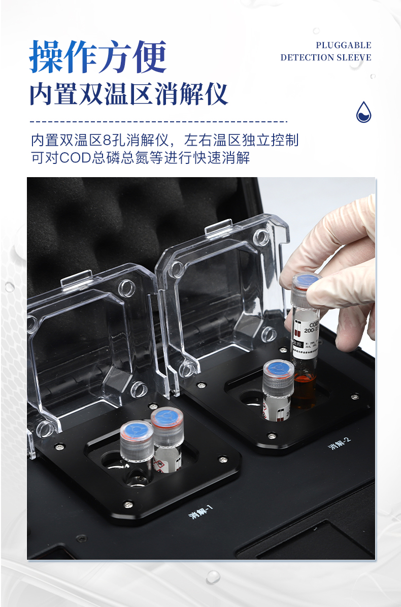 | 1、采用安卓智能系統7.1.1版本,更流暢的交互體驗,運轉速度更快速,穩定性更強。 | 2、雙比色檢測系統,同時支持預制試管比色和比色皿比色; | 3、比色管檢測部分采用360°精密旋轉裝置,有效保證精度,穩定性10倍提升。 | 4、內置雙溫區8孔消解儀,左右溫區獨立控制,可對COD總磷總氮等進行快速消解。 | 5、便攜一體式檢測設備,內置大容量鋰電池,可一機實現戶外水樣消解、測定。 | 6、內置熱敏打印機,支持自動、批量打印,可靈活選擇、編輯打印內容,支持二維碼打印。 | 7、儀器具有WIFi無線、4G遠傳和RJ45有線聯網功能,將數據上傳; | 8、配備霍爾德數據云平臺,可接收儀器的檢測數據,應用于線上數據存儲、長短期動態分析; | 9、用戶可自建標樣曲線,提供系數曲線和樣品曲線的自定義標定。 | 10、儀器內置教學演示視頻,用戶可邊看視頻邊操作實驗,更容易上手。 | 11、檢測、消解可同時進行,大大提**率。 | 12、可根據用戶要求定制檢測項目。 | 13、配備工廠預制試劑耗材,無需反復移液和配制濃硫酸,只需要在試管內加入水質樣品即可進行檢測。 | 14、內置人性化置頂功能,可將常測定指標進行置頂,置頂后顯示在項目列表*上方,無需每次繁瑣找??; |