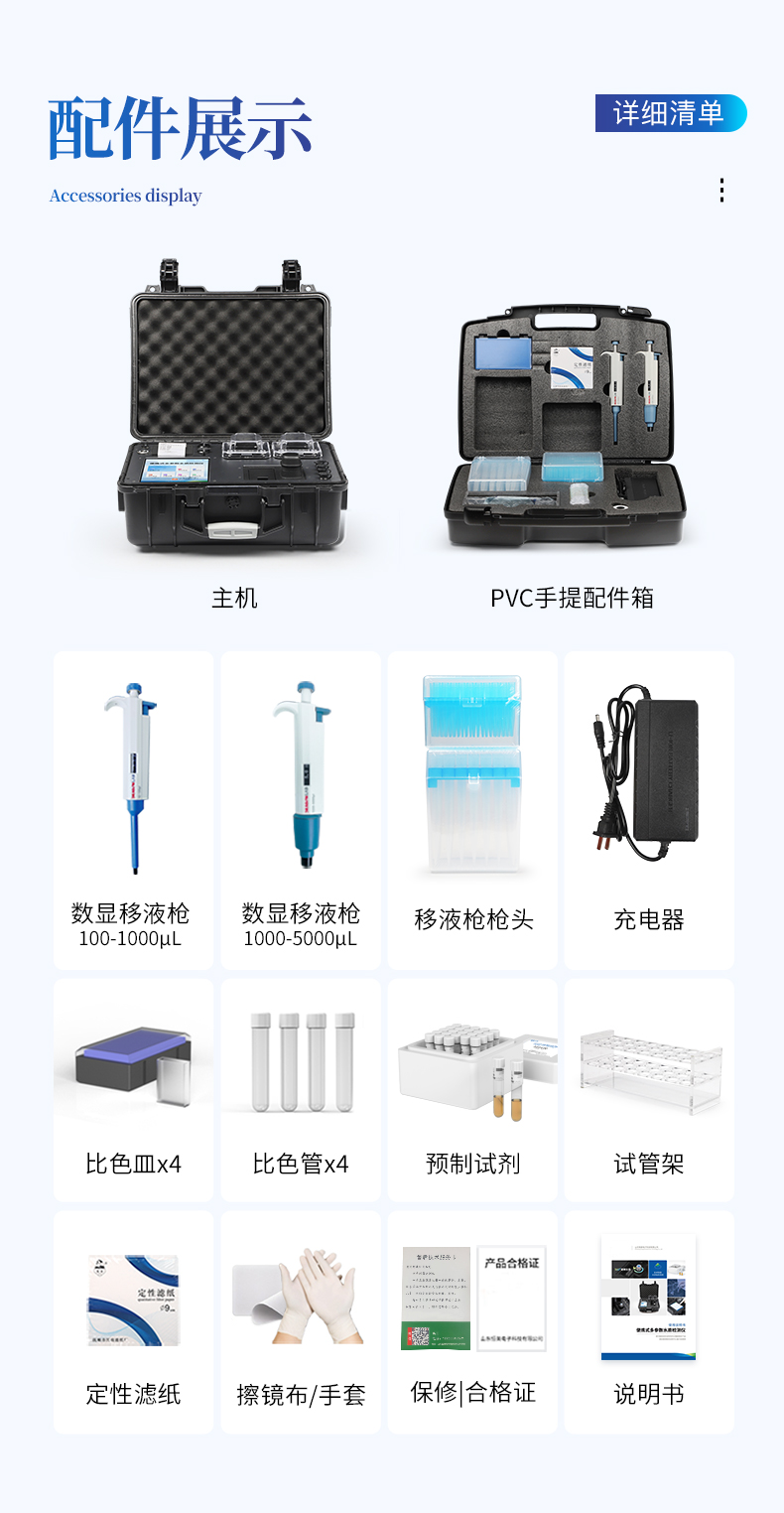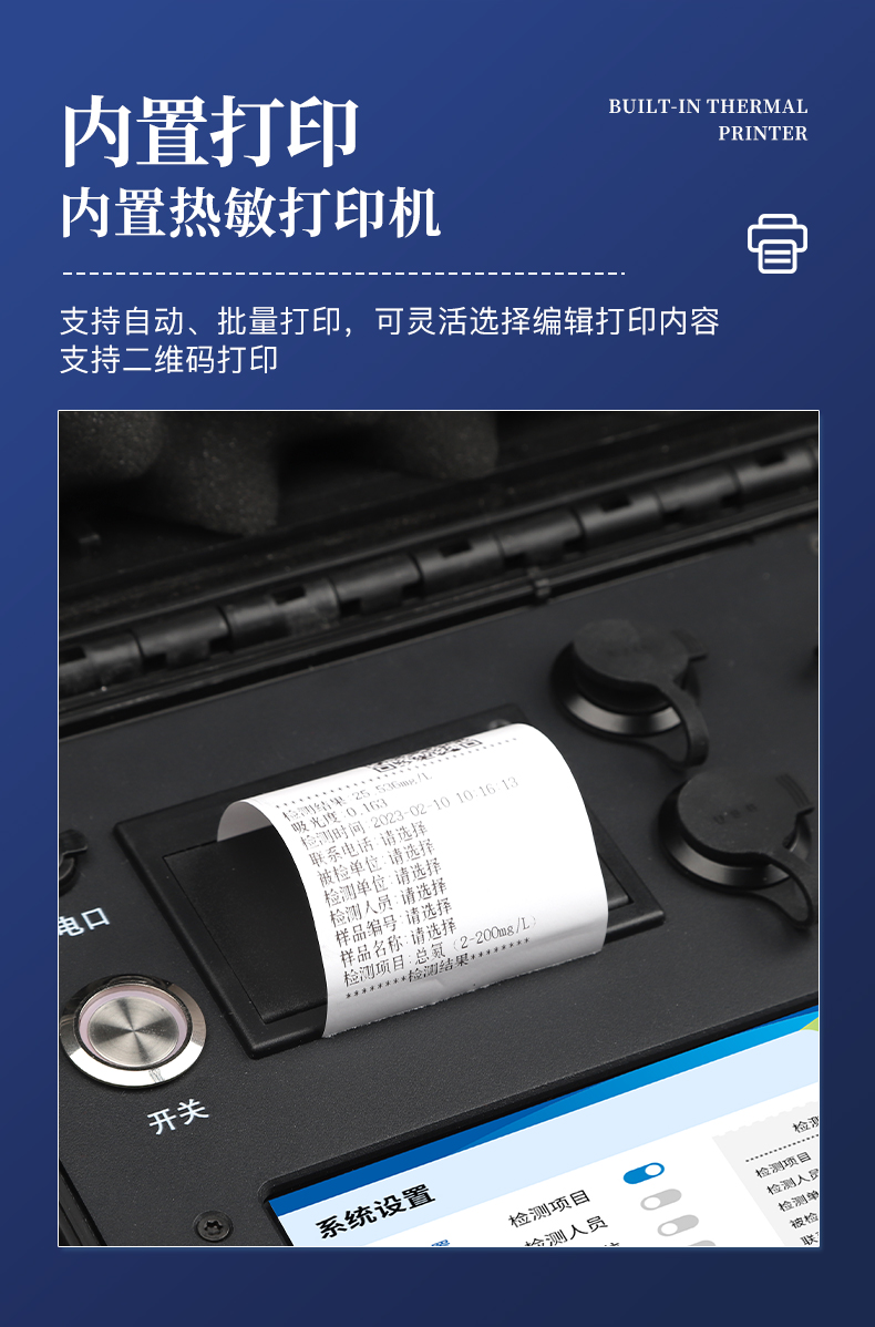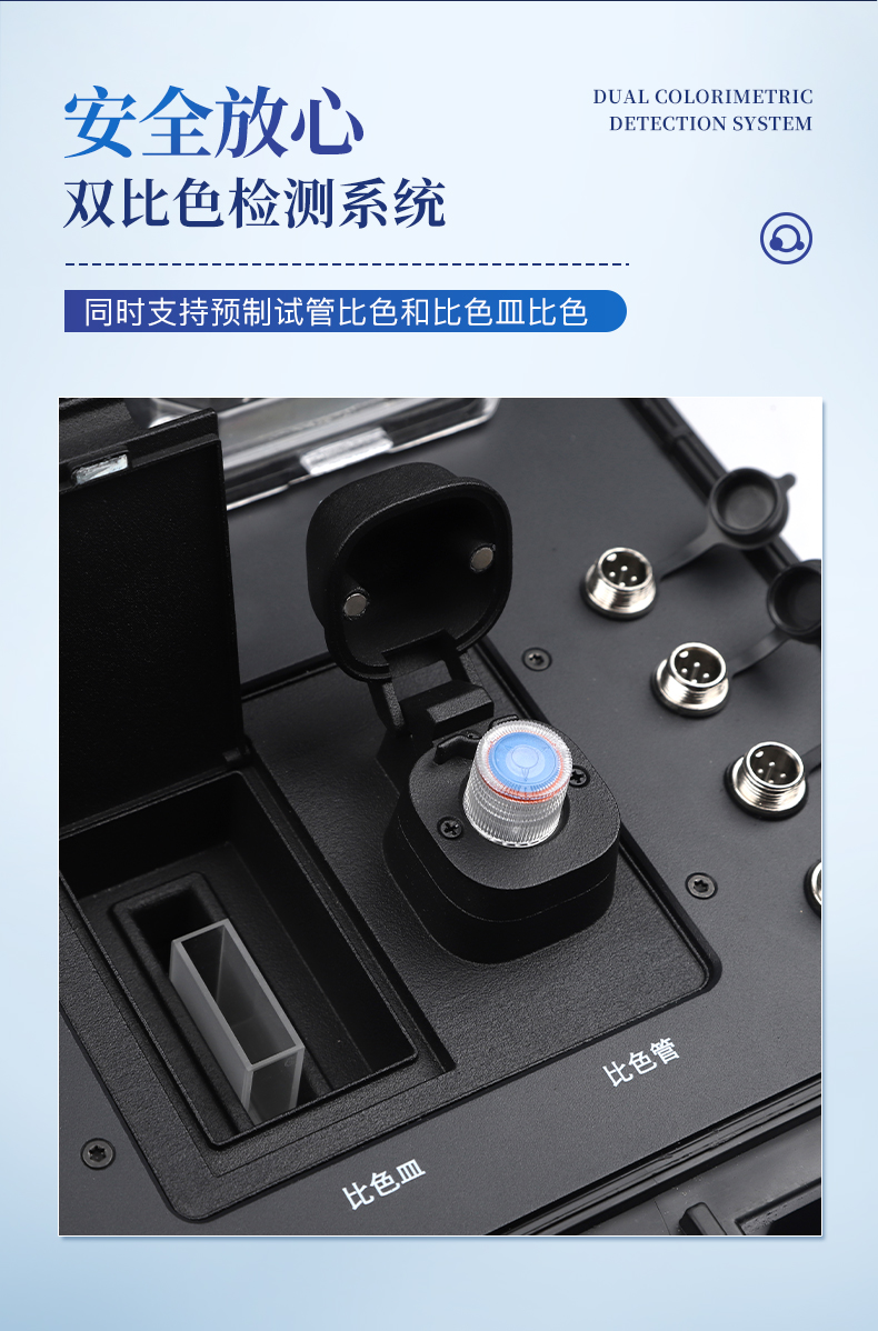 | 1、采用安卓智能系統7.1.1版本,更流暢的交互體驗,運轉速度更快速,穩定性更強。 | 2、雙比色檢測系統,同時支持預制試管比色和比色皿比色; | 3、比色管檢測部分采用360°精密旋轉裝置,有效保證精度,穩定性10倍提升。 | 4、內置雙溫區8孔消解儀,左右溫區獨立控制,可對COD總磷總氮等進行快速消解。 | 5、便攜一體式檢測設備,內置大容量鋰電池,可一機實現戶外水樣消解、測定。 | 6、內置熱敏打印機,支持自動、批量打印,可靈活選擇、編輯打印內容,支持二維碼打印。 | 7、儀器具有WIFi無線、4G遠傳和RJ45有線聯網功能,將數據上傳; | 8、配備霍爾德數據云平臺,可接收儀器的檢測數據,應用于線上數據存儲、長短期動態分析; | 9、用戶可自建標樣曲線,提供系數曲線和樣品曲線的自定義標定。 | 10、儀器內置教學演示視頻,用戶可邊看視頻邊操作實驗,更容易上手。 | 11、檢測、消解可同時進行,大大提**率。 | 12、可根據用戶要求定制檢測項目。 | 13、配備工廠預制試劑耗材,無需反復移液和配制濃硫酸,只需要在試管內加入水質樣品即可進行檢測。 | 14、內置人性化置頂功能,可將常測定指標進行置頂,置頂后顯示在項目列表*上方,無需每次繁瑣找??; |