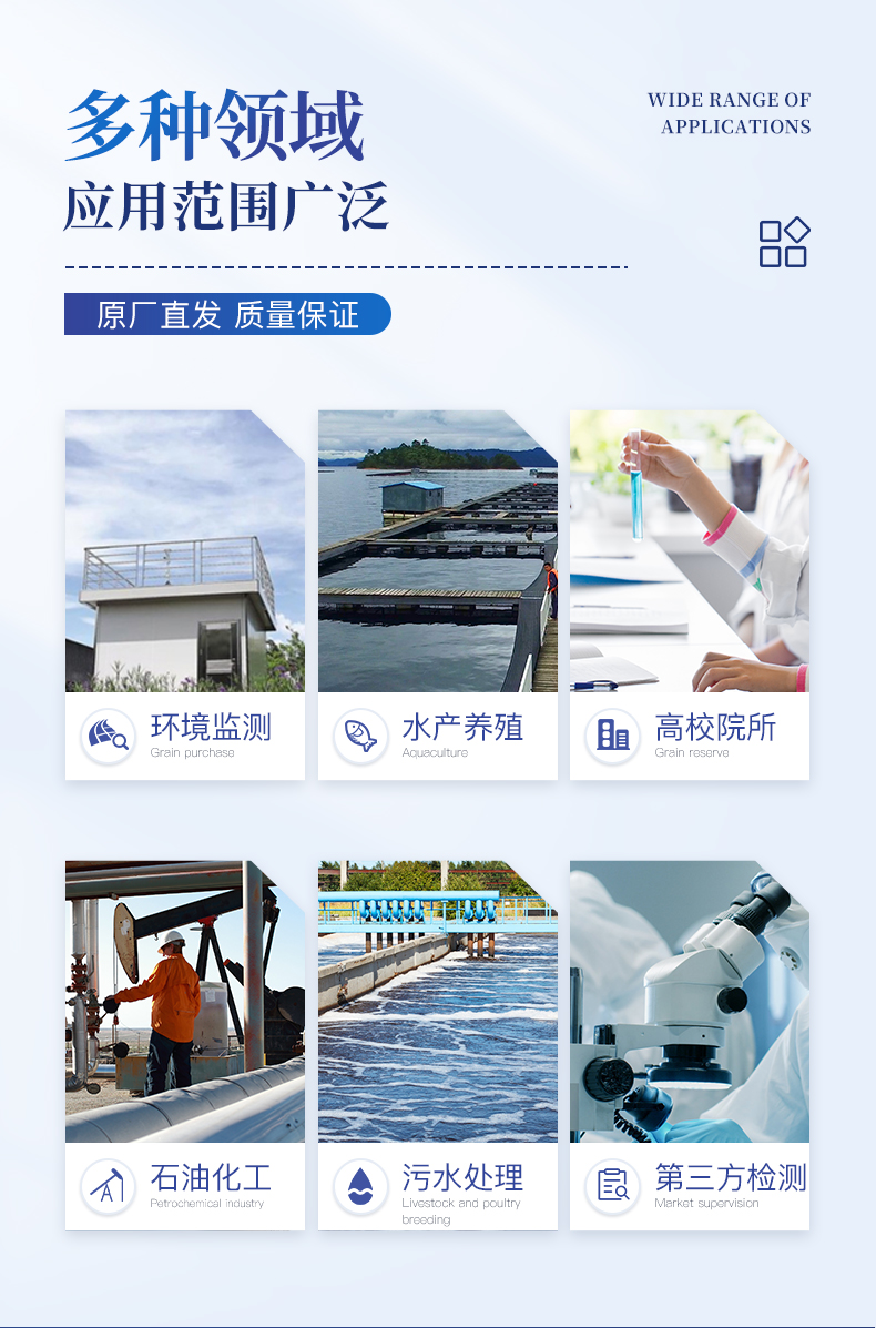 適用于生活污水、工業廢水、地下水、地表水中多種水質污染物的檢測;運用于水質檢測實驗室、市政、污水處理廠、環境監測站及教育科研高校、電廠、疾控中心、造紙電鍍、水產養殖、生物制藥、石化、煤炭、冶金、紡織、食品等行業的水質分析。