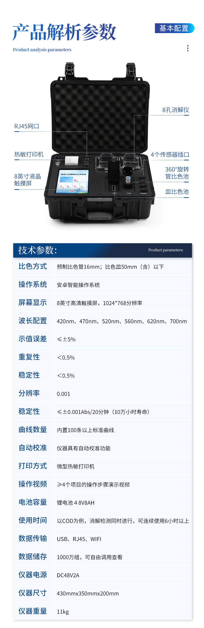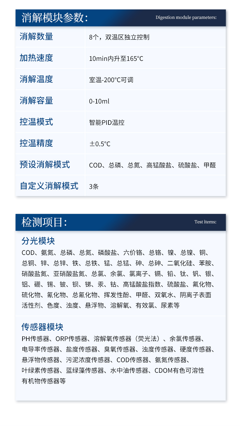 | 1、COD 依據標準:HJ/T399-2007水質化學需氧量快速檢測法 ; 檢測量程:10-15000mg/L(分段) ; | 2、氨氮 依據標準:HJ535-2009水質氨氮的測定納什試劑分光光度法; 檢測量程:0.05-200mg/L(分段); | 3、總磷 依據標準:GB11893-89水質總磷的測定鉬酸銨分光光度法; 檢測量程:0.02-3mg/L(分段); | 4、總氮 依據標準:變色酸分光光度法; 檢測量程:0.5-200mg/L(分段); | 比色方式:預制比色試管16mm;比色皿50mm(含)以下; | 操作系統:安卓智能操作系統; | 屏幕顯示:8英寸高清觸摸屏,1024*768分辨率; | 波長配置:420nm、470nm、520nm、560nm、620nm、700nm; | 示值誤差:≤±5%; | 重復性:<0.5%; | 穩定性:<0.5%; | 分辨率:0.001; | 光學穩定性:≤±0.001Abs/20分鐘(10萬小時壽命); | 自動校準:儀器具有自動校準功能; | 打印方式:微型熱敏打印機; | 操作視頻:≥4個項目的操作步驟演示視頻; | 上傳功能:可無線聯網上傳數據至云平臺,可在手機及電腦端實時查看; | 電池容量:鋰電池48V8AH; | 滿電使用時間:以COD為例,消解檢測同時進行,可連續使用6小時以上; | 數據傳輸:USB、RJ45、WIFI; | 消解數量:8個,雙溫區獨立控制; | 加熱速度:10min內升至165℃; | 消解溫度:室溫-200℃可調; | 消解容量:0-10ml; | 控溫模式:智能PID溫控; | 控溫精度:±0.5℃; | 預設消解模式:COD、總磷、總氮、高錳酸鹽、硫酸鹽、甲醛; | 自定義消解模式:3條; | 數據儲存:1000萬組,可自由調用查看; | 儀器電源:DC48V2A; | 儀器尺寸:430mmx350mmx200mm; | 儀器重量:11kg; |
