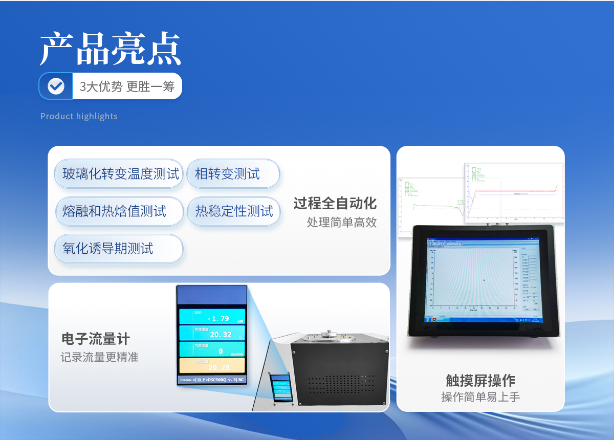 全功能差示掃描量熱儀為觸摸屏式,可進行玻璃化轉變溫度測試、相轉變測試、熔融和熱焓值測試、熱穩定性測試、氧化誘導期測試。