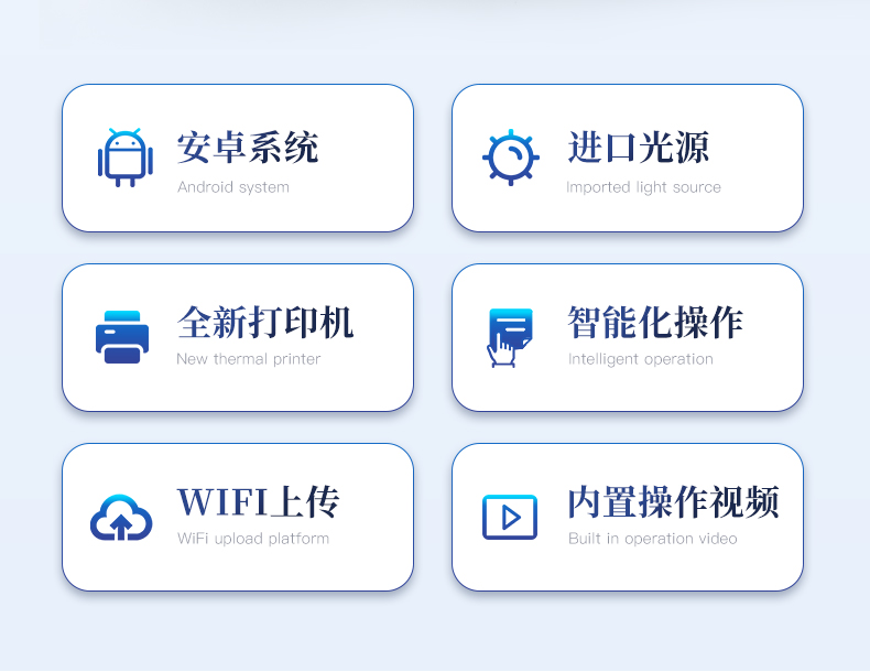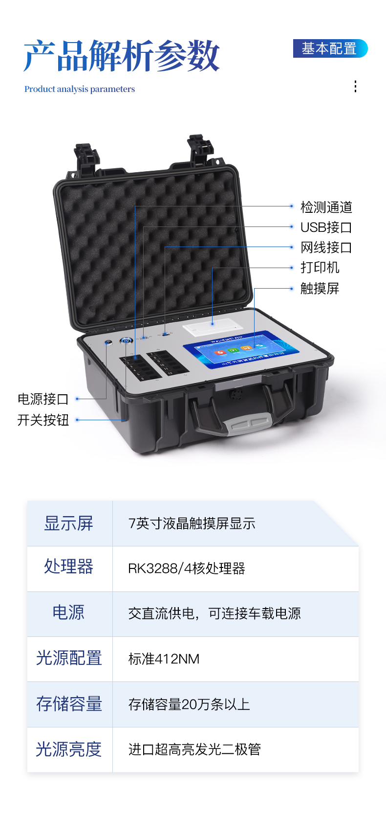 | 主控芯片采用32位處理器,運轉速度更快,穩定性強。 | 直流12V供電,可連接車載電源。 | 光源亮度自動調節與校準 | 脈沖式恒流驅動,避免連續發光引起光衰和溫漂。 | 可設置密碼登錄 | 不間斷進樣,連續檢測 | 樣本編號自動累加。 | 檢測項目可擴充。 | 檢測結果可批量打印,批量上傳。 | 檢測結果為Excel表格,連接電腦即可拷貝。 | 檢測結果存儲容量20萬條 | 固件可升級 |