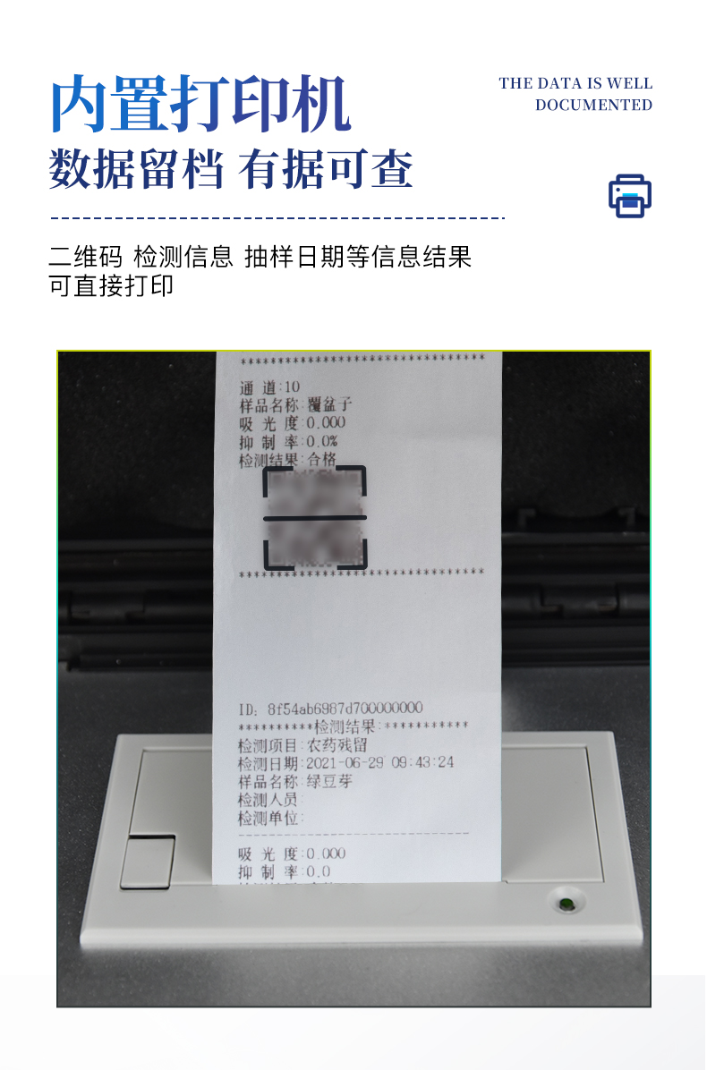 | 隨著人民生活水平的不斷提升,市場對茶葉的把控愈加嚴格。針對現狀,我司專門研發生產--茶葉專用的農藥殘留速測儀;定位茶農、茶商、茶葉企業使用。 此外還可用于果蔬茶生產基地和農貿批發銷售市場現場檢測,餐館、學校、食堂、家庭果蔬加工前的安全速測等。 | 檢測通道: 5個檢測通道,可以同時測試多個樣品,每個樣品由程序控制分別獨立工作,不會互相干擾。 | 顯示方式:≥5英寸液晶觸摸屏顯示,人性化中文操作界面,讀數直觀、簡單。 | 配備嵌入式高速熱敏打印機,可選擇手動打印或者自動打印,三分鐘出打印結果。 | 光源采用進口超高亮發光二極管,具有低功耗、穩定性強、高靈敏度,高檢測精度,高重復性精度,光源可控、響應速度快等優點。 | 采用標準USB接口設計,免驅動安裝,方便數據的存貯和移動,并可隨時與計算機直接相連,并且可用計算機控制儀器。實現數據查詢、瀏覽、分析、統計、打印等。 | 智能化程度高,儀器具有自檢功能:具有開機自檢和調零功能,具有自動檢測重復性功能 | 內置強大的數據庫,可在儀器上直接選擇樣品名稱、檢測指標、送檢單位等信息,也可在儀器上直接編輯錄入樣品名稱、檢測指標、送檢單位等信息并保存進樣品數據庫。 | 支持Wifi網絡,數據可局域網和互聯網數據上傳,檢測結果直接傳至食品安全監管平臺。進行區域食品安全監管及大數據分析處理,檢測區域食品安全長短期動態,達到食品安全問題預估、預警 |