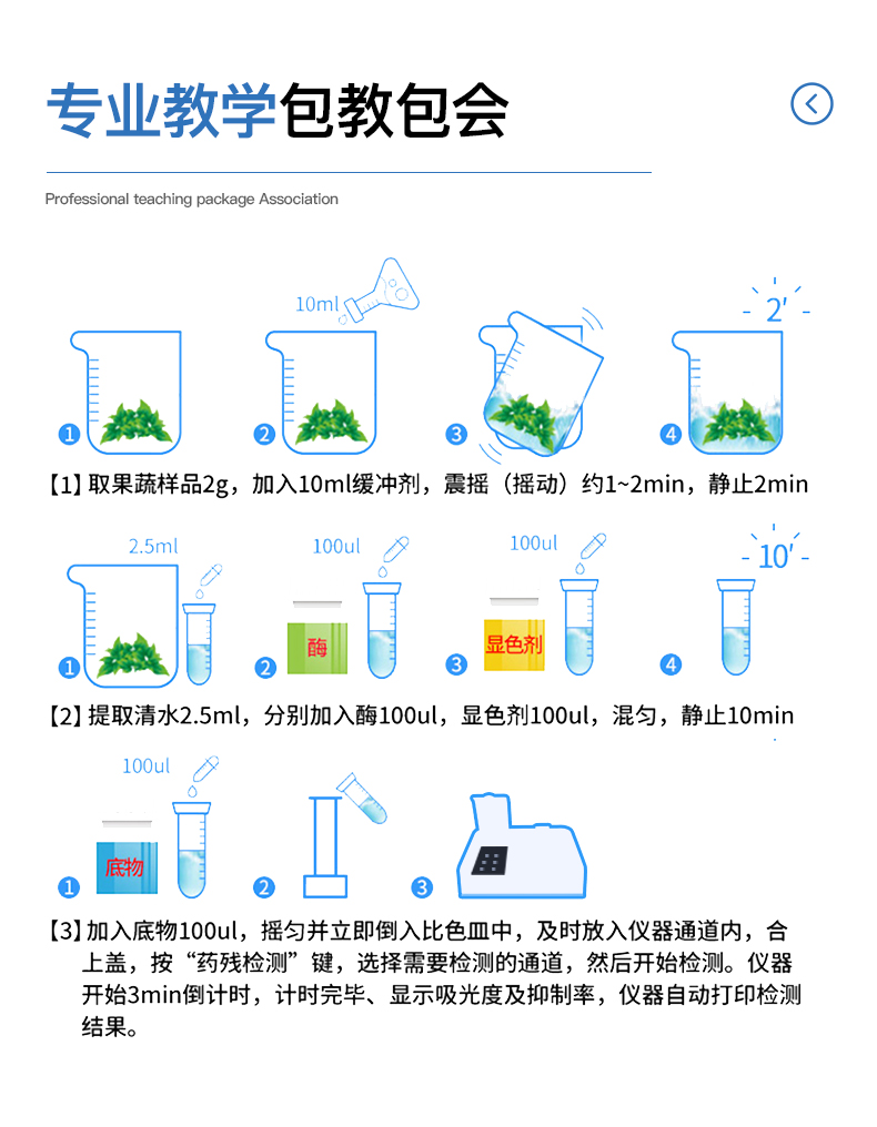 | 1. 檢測方法:蛋白質檢測方法符合【****】《NYT 1678-2008》 | 2. 儀器構成:由主機、樣品前處理器具和試劑包等構成,適于現場及實驗室使用 | 3. 光路系統:采用進口超高亮發光二極管,光源和檢測器采用全固態結構,準確度和精密度高、穩定性強、光源可控;采用光源自動開關節能設計,光源使用壽命達10萬小時以上。 | 4. 內置曲線:儀器具有內置工作曲線,無需配制標準溶液,只需要用配套試劑進行零點校正后,即可實現樣品的快速定量測定。 | 5. 測量方式:樣品顯色和測量為為標準1cm比色皿,無需轉移,提高檢測精密度。 | 6. 耗材配件:提供完備的專用前處理設備和耗材,一站式服務。 | 7. 專用試劑盒:配備專用的預制試劑,縮短試劑配制時間,操作簡單,使用方便。 |
