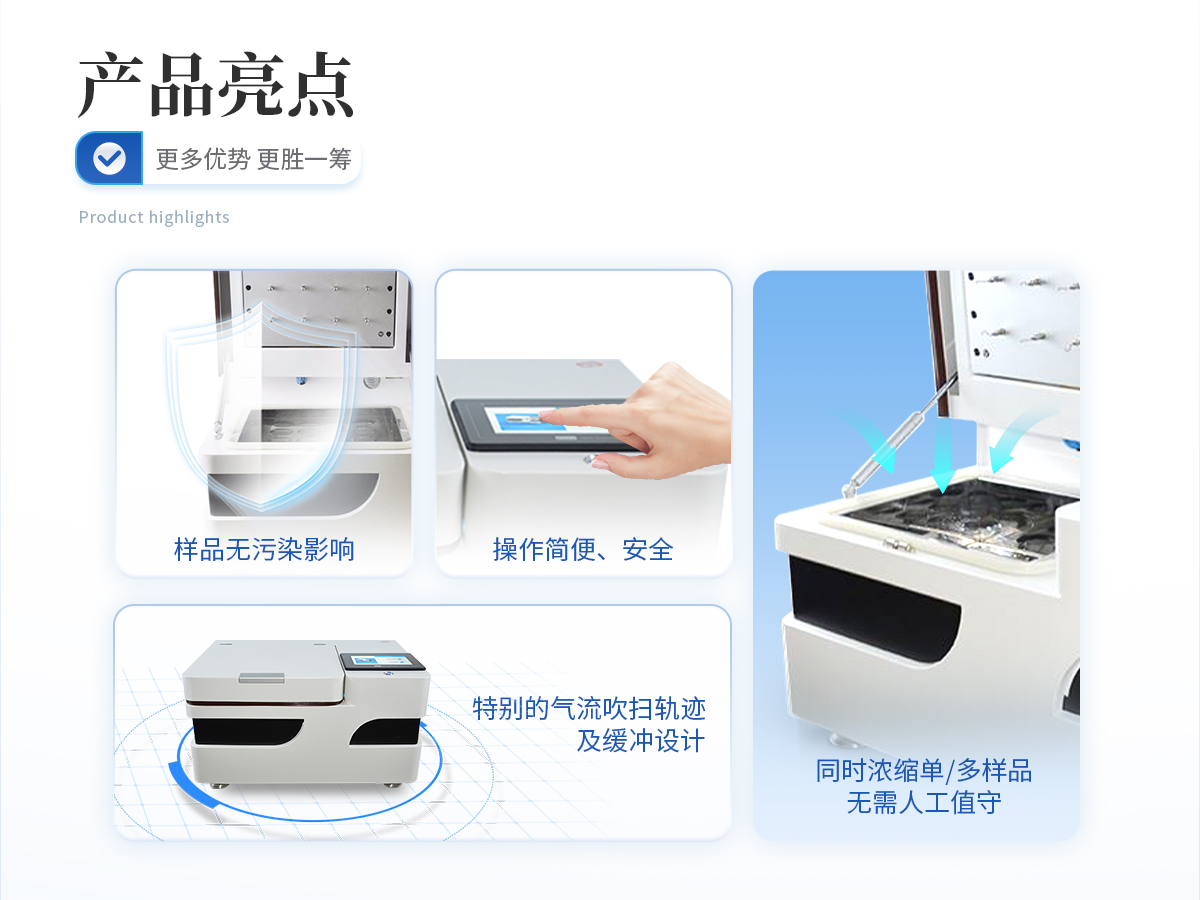 全自動多功能干式氮吹儀HM-QD24是我司結(jié)合實驗室使用需求,從使用者方便安全快捷穩(wěn)定等多角度共同開發(fā)的新型濃縮定容產(chǎn)品,產(chǎn)品擺脫了常規(guī)市場上利用水浴加熱揮發(fā)而導(dǎo)致樣品進行污染的弊端,確定樣品的安全性與準(zhǔn)確性,具有無人值守、準(zhǔn)確定容、大批量濃縮的特點,可多組數(shù)據(jù)儲存功能,實現(xiàn)了全自動化的定量及批量濃縮,濃縮全程,讓繁瑣的濃縮過程變得靈活、省心、**和安全。