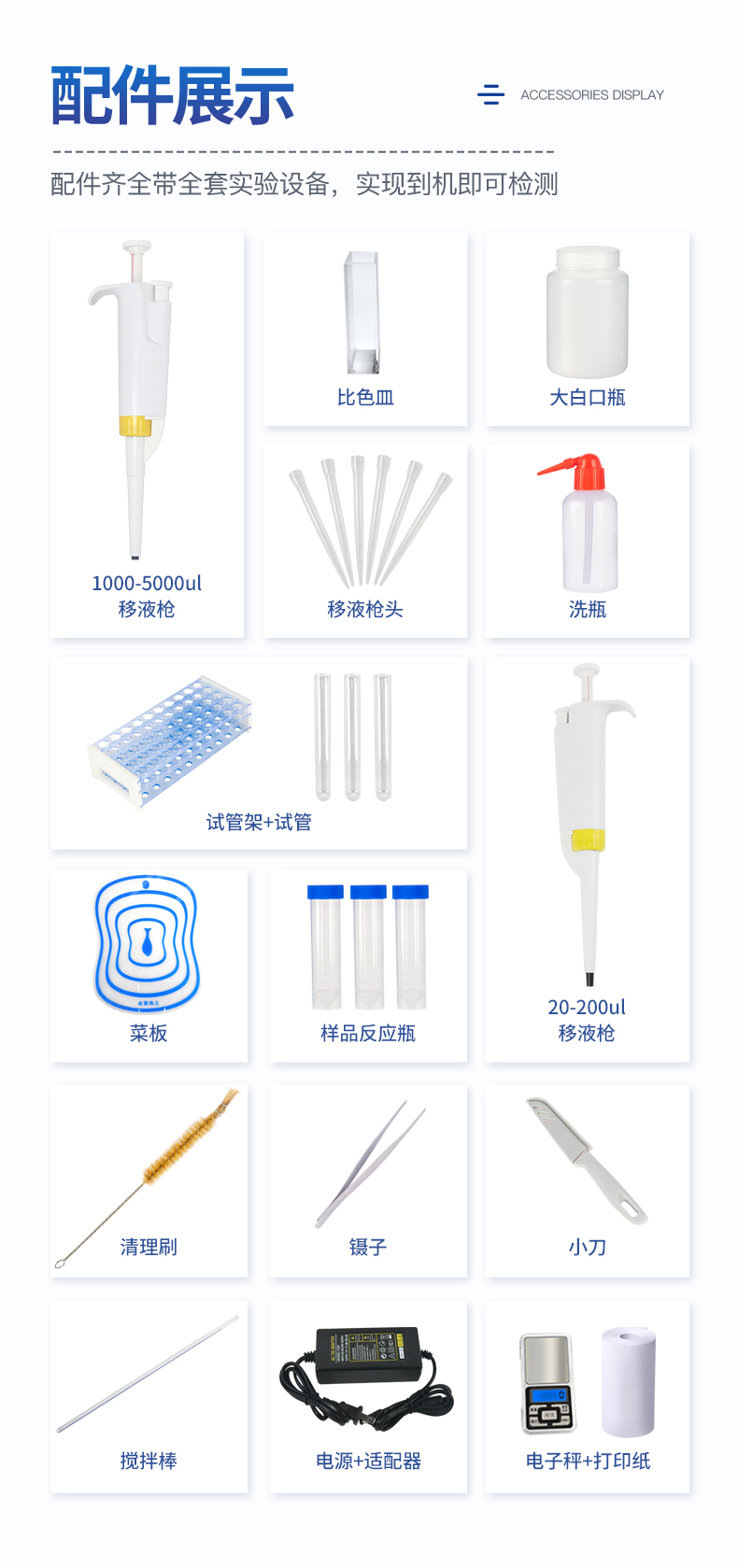 | 乙酰膽堿酯酶和丁酰膽堿酯酶試劑均可以使用,符合****和農業部標準的要求。 | 安卓智能操作系統,采用更加人性化操作,主控采用多核處理器,主頻1.88Ghz,運轉速度更快速,穩定性更強。 | 儀器具有4G無線遠傳、wifi聯網上傳、網線連接功能,快速上傳數據,進行數據管理與統計。 | 自動判斷樣品是否合格,檢測結果更加直觀。 | 儀器具有100多種蔬菜名稱菜單庫,分類管理,并可按需添加或刪除蔬菜名,編輯蔬菜名稱,可直接打印出蔬菜名稱。 | 檢測通道:8個檢測通道,可以同時測試多個樣品,循環檢測,即放即檢,每個樣品由程序控制分別獨立工作,不會互相干擾。 | 顯示方式:7英寸高靈敏真彩觸摸屏顯示,人性化中文操作界面,讀數直觀、簡單。 | 新一代高速打印機,可同時打印二維碼,打印格式為檢測人姓名、吸光度差值、檢測時間、檢測機構、樣品名稱及結果判定。 | 光源采用進口超高亮發光二極管,具有低功耗、高精度、穩定性強、光源可控可以關掉不使用的光源,響應速度快等優點。 | 智能恒流穩壓,光強自動校準,長時間連續工作光源無溫漂現象。 | 采用USB2.0接口設計,方便數據的存貯和移動,并可隨時與計算機直接相連,并且可用計算機控制儀器。實現數據查詢、瀏覽、分析、統計、打印等。 | 智能化程度高,儀器具有自檢功能,具有開機自檢和調零功能,具有自動檢測重復性功能 | 儀器具有自身保護功能,可設置用戶名及密碼,防止非工作人員操作等。 | 采用DC12v直流供電,安全系統更高,并且配備6A鋰電池充電器。 | 儀器具有重新校準、鎖定、恢復出廠設置功能。 |