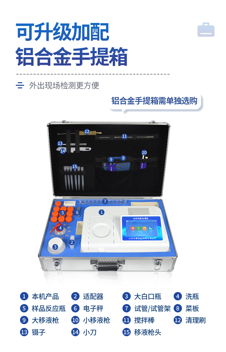 | 乙酰膽堿酯酶和丁酰膽堿酯酶試劑均可以使用,符合****和農業部標準的要求。 | 自動判斷樣品是否合格,檢測結果更加直觀。 | 儀器具有100多種蔬菜名稱菜單庫,分類管理,并可按需添加或刪除蔬菜名,編輯蔬菜名稱,可直接打印出蔬菜名稱。 | 檢測通道:12個檢測通道,可以同時測試多個樣品,循環檢測,即放即檢,每個樣品由程序控制分別獨立工作,不會互相干擾。 | 智能操作系統,采用更加人性化操作,主控采用多核處理器,主頻1.88Ghz,運轉速度更快速,穩定性更強。 | 顯示方式:7英寸高靈敏真彩觸摸屏顯示,人性化中文操作界面,讀數直觀、簡單。 | 打印機采用串口5v打印,可選擇手動打印或者自動打印,三分鐘出打印結果,打印格式為檢測人姓名、吸光度差值、檢測時間、檢測機構、樣品名稱及結果判定。 | 光源采用進口超高亮發光二極管,具有低功耗、高精度、穩定性強、光源可控可以關掉不使用的光源,響應速度快等優點。 | 智能恒流穩壓,光強自動校準,長時間連續工作光源無溫漂現象。 | 儀器具有GPRS遠傳功能,可插手機卡實現數據遠傳平臺,wifi聯網功能,可將數據快速上傳電腦,進行數據管理與統計。 | 采用USB2.0接口設計,方便數據的存貯和移動,并可隨時與計算機直接相連,并且可用計算機控制儀器。實現數據查詢、瀏覽、分析、統計、打印等。 | 智能化程度高,儀器具有自檢功能:具有開機自檢和調零功能,具有自動檢測重復性功能 | 儀器具有自身保護功能,可設置用戶名及密碼,防止非工作人員操作等。 | 采用DC12v直流供電,安全系統更高,并且配備6A鋰電池充電器。 | 儀器具有重新校準、鎖定、恢復出廠設置功能。 |