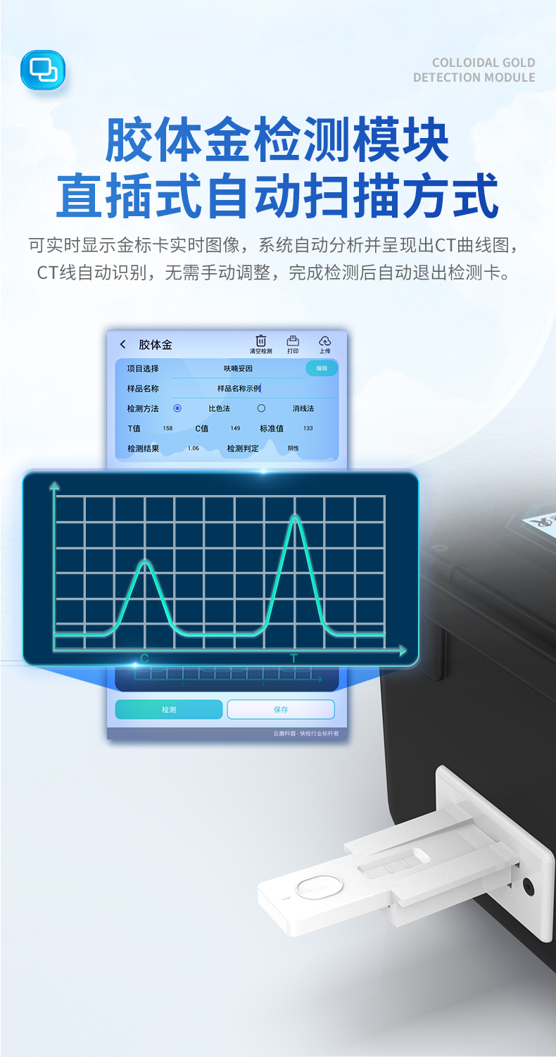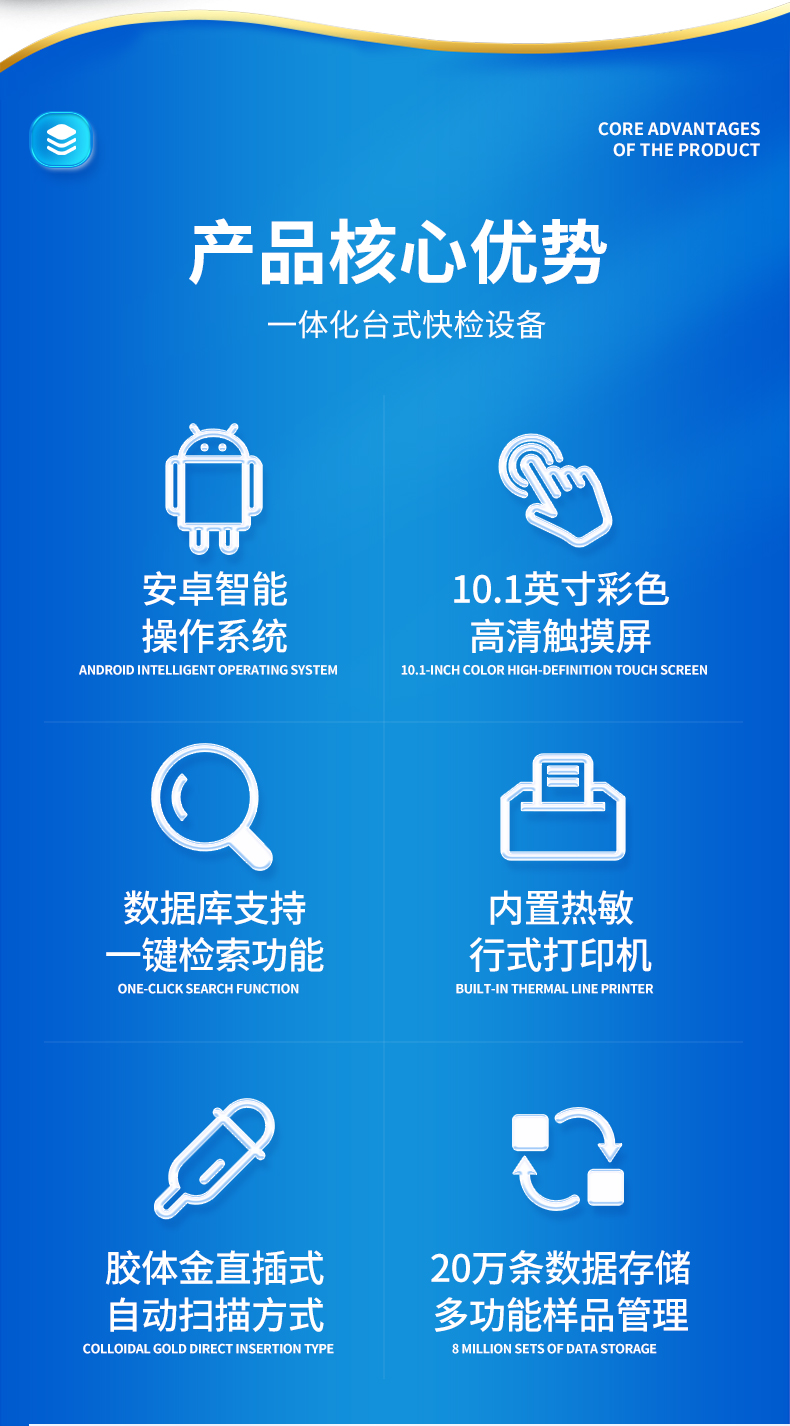 | 1、儀器采用10.1英寸液晶觸摸屏顯,搭配運行安卓智能操作系統,主控芯片采用ARM Cortex-A7,RK3288/4核處理器,主頻1.88Ghz,運轉速度更快速,性能更強。 | 2、儀器功能包括:膠體金檢測模塊、數字化管理模塊、無線通訊模塊等,可以滿足同一軟件下實現所有檢測項目的檢測,并在同一窗口展示檢測結果。 | 3、一體化便攜式快檢設備,采用交直流兩用供電方式,可連接車載電源,配備6ah大容量充電鋰電池,可以滿足現場及流動檢測使用的需求。儀器尺寸:43×35×20cm, 主機凈重:5.1kg | 4、系統自帶數據集成模塊,設備首頁自動統計檢測數據包含:周檢測數據、月檢測數據,全部檢測總數量,均包含檢測總數,合格數,不合格數,以及相關柱形分析圖,對各項檢測數據清晰掌握,無需電腦查詢,更加快捷直觀。 | 5、儀器具有任務預設模塊,可在樣品送檢前提前預設樣品名稱、檢測指標、送檢單位等信息,樣品送檢時一鍵調取保存信息,檢測更加方便快捷。 | 6、膠體金檢測模塊: 軌道式自動傳輸掃描方式,可實時顯示金標卡實時圖像,系統自動分析并呈現出CT曲線圖,CT線自動識別,無需手動調整,完成檢測后自動退出檢測卡。 結果判定線可修改,對照值標定值可保存,斷電不丟失數據。 兼容市場上其他膠體金卡,使用耗材不受限制,極大增強用戶使用體驗。 | 7、圖像調整功能:可根據金標卡讀取圖像進行多方位調整,使其更精準讀取結果。 | 8、儀器檢測系統擁有龐大數據庫,并且構建了完善的檢索、修訂功能。食品庫涵蓋多種樣品名稱,可按需添加或刪除、編輯樣品名稱;產品數據庫以及歷史檢測記錄支持一鍵檢索功能。 | 9、系統打印自定義化,打印格式多樣化,產品合格證(****要求),二維碼,抽樣信息、檢測信息,受檢信息、復核信息、抽樣日期、檢測日期等信息結果,可按需求自行設置打印內容。 | 10、A4紙版本報告打印功能:設備擁有兩種結果展示方式,可以自動生成A4打印模板和小票打印模板兩種樣式,可通過WiFi及網線等方式鏈接外置打印機可進行打印 | 11、儀器具有 wifi 聯網上傳、RJ45網線連接功能,可以快速上傳數據。同步對接監管平臺,數據可局域網和互聯網數據上傳,檢測結果直接傳至食品安全監管平臺。進行區域食品安全監管及大數據分析處理與數據統計,檢測區域食品安全長短期動態,達到食品安全問題預估、預警。 | 12、設備支持U盤存儲,標準USB接口,免驅動安裝。檢測結果存儲容量20萬條以上,可生成Excel表格,進行一鍵拷貝,并具有登錄保護功能,可設置用戶名及密碼,規范不同人員操作權限,防止非工作人員操作,并且可以進行重新校準、鎖定、恢復出廠設置功能。儀器固件可升級,后期檢測項目可擴充。 | 13、儀器具備遠程升級功能,可定向分客戶分儀器更新,開機后自動更新,并可持續性免費更新系統版本,無需像傳統產品返廠更新,節省時間及人力成本并避免了物流運輸返廠升級導致設備損壞的潛在風險。 |