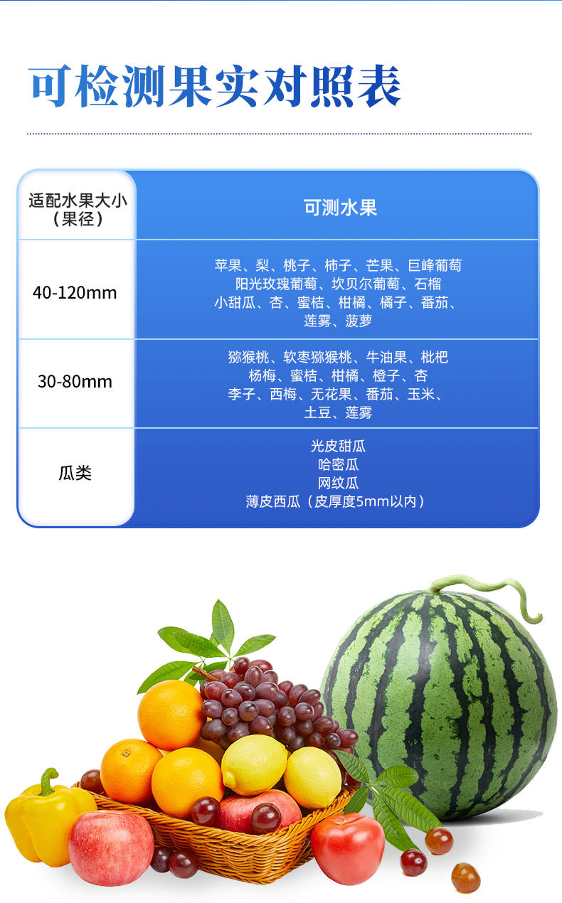 a.糖度(可溶性固形物SSC) b.干物質 c.水分 備注:實際可檢測項目隨果品種類不同而有區別 |