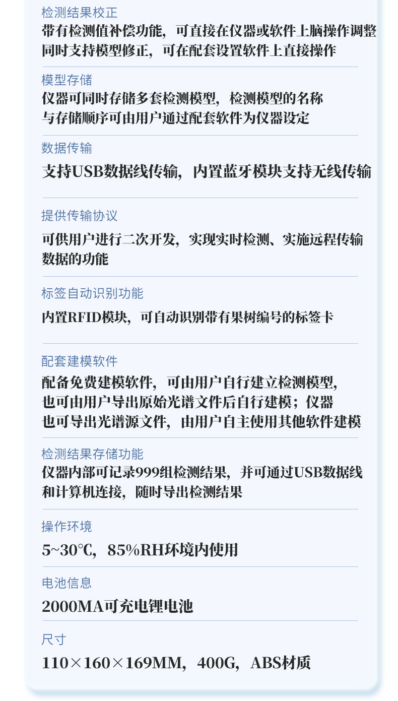 7.檢測時間:3秒顯示結果; | 8.電源:充滿電后可連續檢測2000次,附帶直流12V/3A充電器; | 9.精度:糖度檢測精度±0.5%,干物質檢測精度±0.5%,具體表現由果品特性和建模效果決定; | 10.檢測結果校正:帶有檢測值補償功能,可直接在儀器或軟件上腦操作調整;同時支持模型修正,可在配套設置軟件上直接操作; | 11.模型存儲:儀器可同時存儲多套檢測模型,檢測模型的名稱與存儲順序可由用戶通過配套軟件為儀器設定; | 12.數據傳輸:支持USB數據線傳輸,內置藍牙模塊支持無線傳輸; | 13.手機/移動終端傳輸功能:可將儀器檢測的結果實時傳輸到配套的手機APP并進行存儲,可在手機上導出存儲的所有檢測結果,儀器配套的手機APP為免費使用; | 14.提供傳輸協議,可供用戶進行二次開發,實現實時檢測、實施遠程傳輸數據的功能; | 15.標簽自動識別功能:內置RFID模塊,可自動識別帶有果樹編號的標簽卡; | 16.支持光譜信息存儲和導出; | 17.配套建模軟件:配備免費建模軟件,可由用戶自行建立檢測模型,也可由用戶導出原始光譜文件后自行建模;儀器也可導出光譜源文件,由用戶自主使用其他軟件建模; | 18.檢測結果存儲功能:儀器內部可記錄999組檢測結果,并可通過USB數據線和計算機連接,隨時導出檢測結果; | 19.操作環境:5~30℃,85%RH環境內使用 | 20.顯示屏:LCD液晶屏 | 21.電池信息:2000mA可充電鋰電池 | 22.尺寸:110×160×169mm,400g,ABS材質 | 23.附件:橡膠遮光罩,充電器,USB數據線,便攜箱,軟件(免費電子版) |