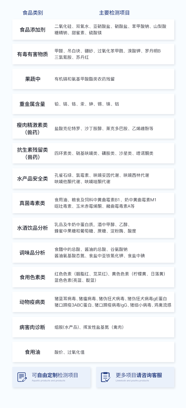 | 各類蔬菜水果中:有機(jī)磷和氨基甲酸酯類農(nóng)藥 | 病害肉診斷:組胺、揮發(fā)性鹽基氮、肉制品酸價(jià)、水發(fā)產(chǎn)品中組胺等 | 瘦肉精(激素類獸藥):鹽酸克倫特羅、沙丁胺醇、萊克多巴胺、己烯雌酚、喹乙醇等 | 抗生素(藥物殘留類獸藥):四環(huán)素類、硝基呋喃類、磺胺類、沙星類、喹諾酮類、慶大霉素、鏈霉素、阿莫西林、紅霉素等 | 水產(chǎn)品安全類:孔雀石綠、氯霉素、呋喃妥因代謝、呋喃西林代謝、呋喃它酮代謝、呋喃唑酮代謝等 |
