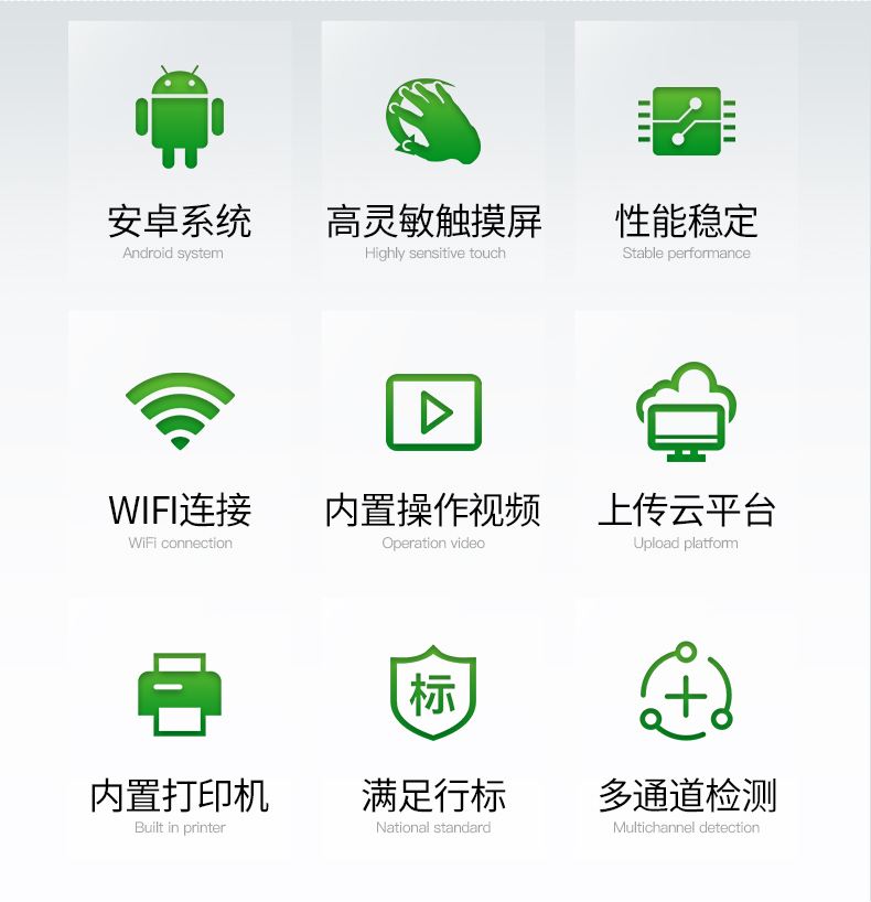 Android安卓智能操作系統,主控芯片采用ARM Cortex-A7,RK3288/4核處理器,主頻1.88Ghz,運轉速度更快速,穩定性更強。采用精密旋轉比色池設計,光源一致性更加**,保證檢測精度。12個旋轉檢測通道,一次性可快速檢測12個樣品,極大提升檢測效率,降低檢測成本。采用高精度濾光片技術自主專利分析方法(***:** 2018 2 1777724.7),權威認證。檢測過程中內置校準功能,智能恒流穩壓,光強自動校準,確保檢測準確度。儀器標配wifi無線上傳、4G聯網傳輸、GPRS無線遠傳,快速上傳數據。配有云平臺,儀器連入無線網絡后,可將檢測數據可選擇性或批量無線上傳,方便用戶進行長期數據管理和可視化分析。儀器配同時具有USB接口、以太網接口,內置大容量內存,并可隨時用U盤拷貝數據。可用手機隨時登錄云平臺在線移動查看歷史數據4波長專業測試冷光源(紅、藍、綠、橙),光源波長穩定,長時間連續工作光源無溫漂現象,壽命長達10萬小時級別,重現性好,準確度高。比色池部分采用標準1cm比色皿,無機械位移及磨損,光路測試定位**,有效屏蔽外光干擾,保證檢測結果優于國標要求。儀器系統內帶有樣品前處理操作視頻,各種樣品檢測方法點擊視頻模塊即可觀看,檢測人員無需自學說明書,指導教學方便快速,方便新手快速操作內置新一代高速熱敏打印機(無需色帶),打印內容包含:檢測單位、檢測人員、檢測項目、通道號、吸光度、含量(mg/kg)、檢測時間、以及二維碼等信息高靈敏7寸真彩觸摸屏,采用更加**和人性化操作,高清晰高交互顯示,大程度降低傳統儀器的繁瑣操作和失誤。內置時鐘功能,方便操作時間記錄,長期歷史追溯。可設置多賬戶賬號密碼登錄,**UI交互界面,不同的用戶可自由添加編輯檢測信息,保存后可長期使用。GPS功能:可在野外作業時記錄經緯度地點,滿足特殊用戶需求。內置低電壓提示功能,可在檢測時明確電量,避免測試數據偏移,同時具有斷電保護功能,斷電自動保存數據,防止數據丟失。交直流兩用供電方式,內置大容量充電鋰電池,滿電狀態下可連續工作10余小時,同時可外接車載電源蓄電。儀器具有中英文切換功能,可滿足出口要求。高強度PVC工程塑料手提箱設計,堅固耐用,便于攜帶。