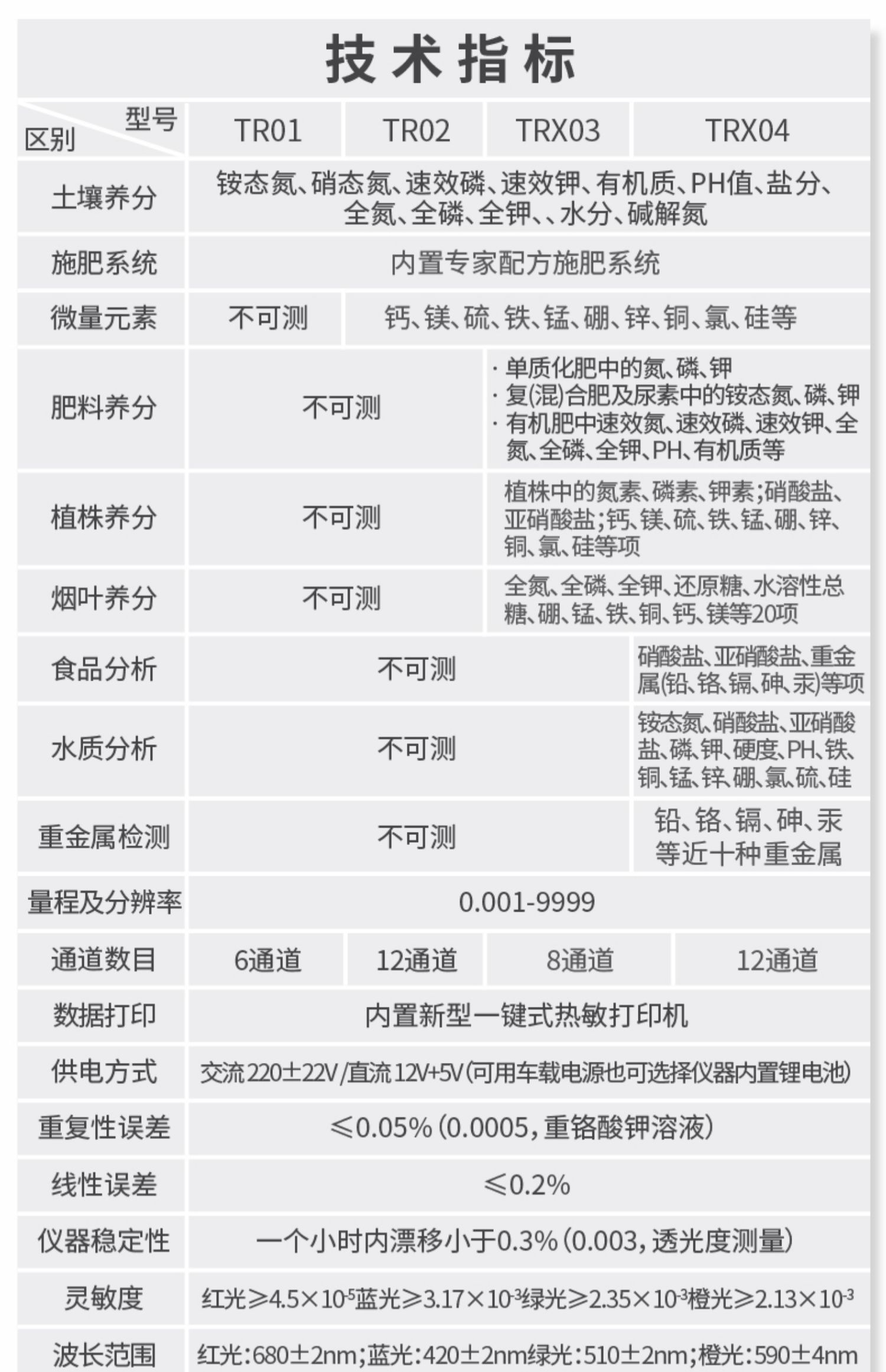 可對土壤、肥料、作物、蔬菜、水果、水質、食品等樣品中的砷、鉛、鎘、鉻、汞、鐵、鋁、鋅、錳、銅等進行快速聯合測定。