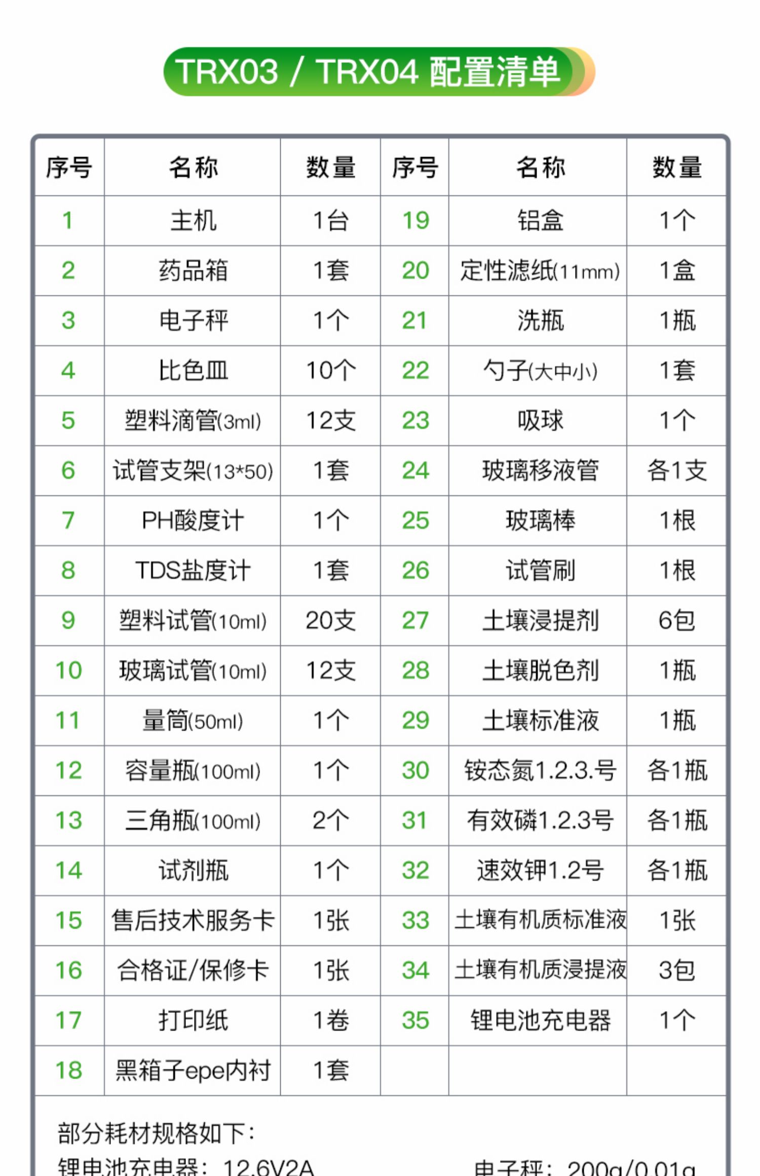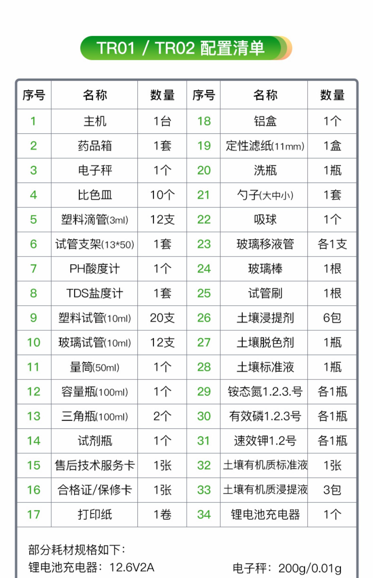 名稱配件箱重金屬試劑定性濾紙比色皿玻璃試管塑料試管三角瓶試劑瓶量筒塑料滴管試管架試管刷洗瓶稱量勺電源適配器TDS計PH試紙