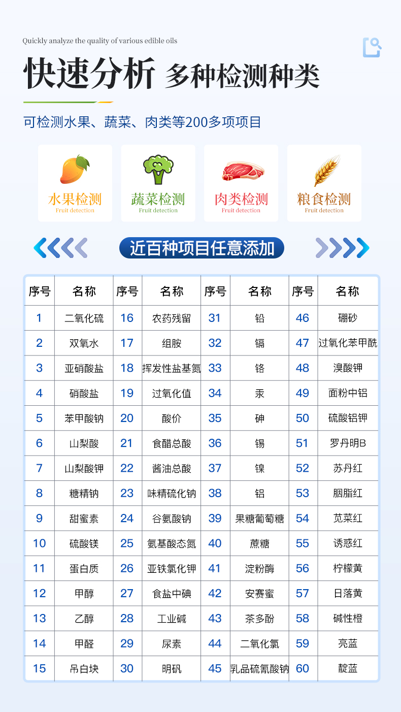 | 1、儀器采用臺式一體化系統(tǒng)檢測技術(shù),將分光光度模塊、數(shù)字化管理模塊、無線通訊模塊高度集成于一體,支持檢測幾十種食品安全檢測項目,同時預(yù)留升級檢測方法。 | 2、儀器檢測模塊標(biāo)準(zhǔn)化、智能化,檢測項目可隨意自由組合。檢測箱體內(nèi)置多個標(biāo)準(zhǔn)檢測單元,檢測模塊可以調(diào)整配置。 | 3、顯示屏幕:儀器采用7英寸液晶觸摸屏,搭配運行安卓智能操作系統(tǒng),主控芯片采用ARM Cortex-A7,RK3288/4核處理器,主頻1.88Ghz,操作方便,性能更強。 | 4、檢測通道:≥12通道;采用精密旋轉(zhuǎn)比色池設(shè)計,使用同芯片同光源校準(zhǔn)精度,解決不同光源之間的誤差值,更加準(zhǔn)確**。 | 5、儀器光源:高精度進口四波長冷光源,每個通道均配置 410、520、590、630nm 波長光源,標(biāo)配**的光路切換裝置,專利光路切換功能可實現(xiàn)64波長,并且所有檢測項目可實現(xiàn)所有通道同時檢測。 | 6、通訊接口:配備無線通信模塊、可選配4G(APN)通訊模塊和藍牙傳輸,同時具有USB接口,可以多方式實現(xiàn)數(shù)據(jù)保存及數(shù)據(jù)傳輸。 | 7、存儲方式:支持U盤存儲,標(biāo)準(zhǔn)USB接口,免驅(qū)動安裝。檢測結(jié)果存儲容量20萬條以上,可生成Excel表格進行拷貝,并具有登錄保護功能。 | 8、智能化操作系統(tǒng): | 8.1、操作系統(tǒng):儀器可在同一檢測界面自動對應(yīng)相關(guān)檢測通道,一次性選擇1-12個樣品名稱,無需退出界面,節(jié)省操作時間。并可以對每個通道屬性和樣品信息單獨進行編輯,例如送檢單位、人員,檢測人員等,打印時勾選打印顯示。 | 8.2、限量規(guī)判系統(tǒng):具有限量查詢、添加物質(zhì)合規(guī)判定系統(tǒng)。檢測出結(jié)果后,系統(tǒng)自動調(diào)用系統(tǒng)數(shù)據(jù)庫中相關(guān)國標(biāo)進行比對判定,客觀顯示結(jié)果是否合格。 | 8.3、數(shù)據(jù)監(jiān)管系統(tǒng):同步對接監(jiān)管平臺,數(shù)據(jù)可局域網(wǎng)和互聯(lián)網(wǎng)數(shù)據(jù)上傳,檢測結(jié)果可選擇直接傳至食品安全監(jiān)管平臺。進行區(qū)域食品安全監(jiān)管及大數(shù)據(jù)分析處理與數(shù)據(jù)統(tǒng)計,檢測區(qū)域食品安全長短期動態(tài),達到食品安全問題預(yù)估、預(yù)警。 | 8.4、打印系統(tǒng):內(nèi)置全新打印機,可以打印:項目名稱,二維碼,抽樣信息、檢測信息,受檢信息、復(fù)核信息、抽樣日期、檢測日期等信息的打印。 | 9、供電模式:儀器交直流兩用,直流12V供電(標(biāo)配),可連接車載電源,亦可選配6ah大容量充電鋰電池,電量可實時顯示,方便戶外流動測試。 | 10、儀器具有重新校準(zhǔn)、鎖定、恢復(fù)出廠設(shè)置功能, | 11、外觀尺寸:415X310X150(mm) ,并可加配鋁合金手提箱 |