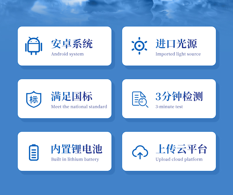 PH、溶解氧、氨氮、亞硝酸鹽、總堿度、硫化氫、鹽度、磷酸鹽、總硬度、水溫、余氯、檢測指標等安卓智能系統操作更佳簡便快捷內置操作流程、操作簡單、無需培訓、直接上手檢測速度快,現場讀取數據便攜式體積小,重量輕,方便戶外檢測外形小巧美觀,工作穩定免維護,具有較好的性價比采用進口冷光源,光學性能穩定,壽命長達10萬小時
