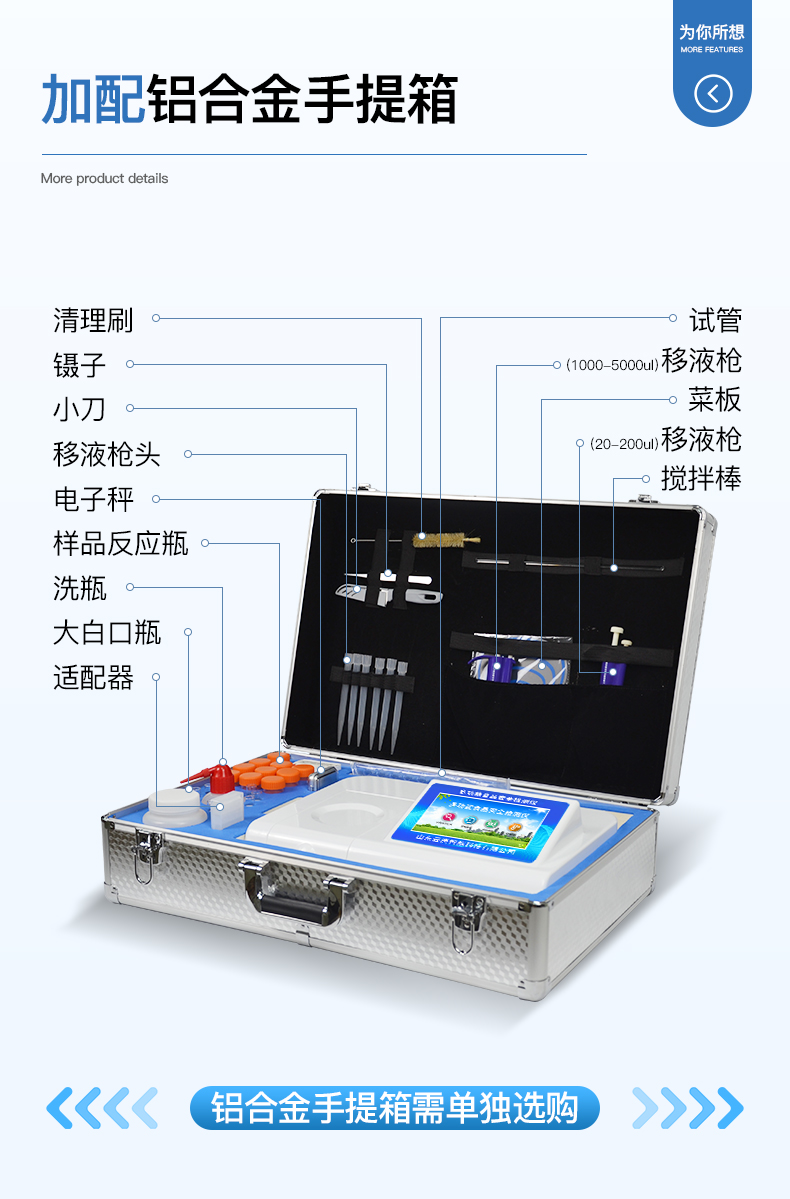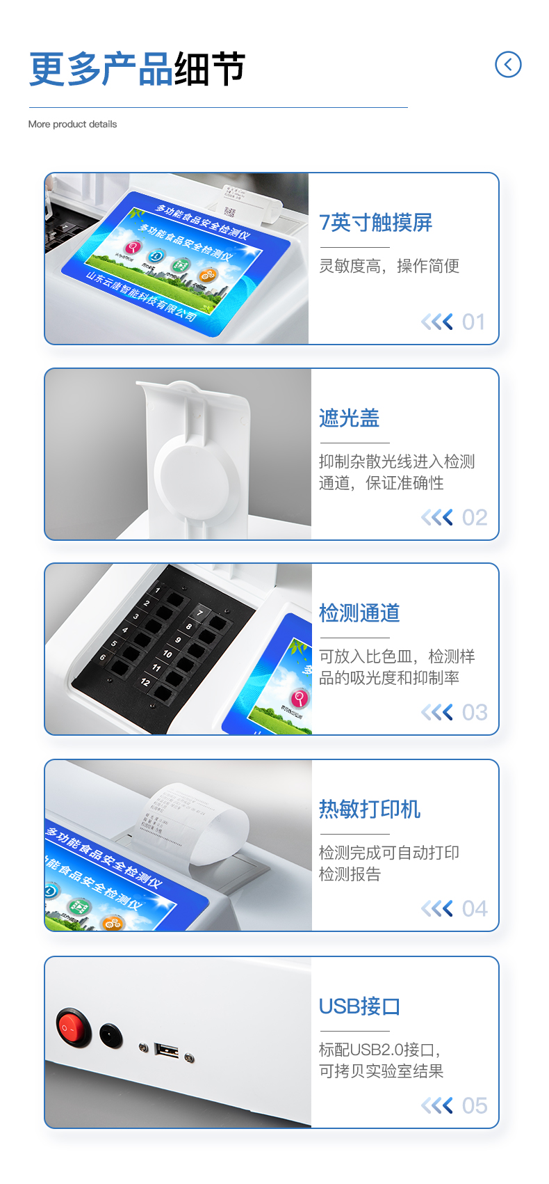 | 主控芯片采用ARM Cortex-A7,RK3288/4核處理器,主頻1.88Ghz,運轉速度更快速,穩定性更強。 | 顯示方式:7英寸液晶觸摸屏顯示,人性化中文操作界面,讀數直觀、簡單。 | 直流12V供電,可連接車載電源,可配6ah大容量充電鋰電池,方便戶外流動測試。 | 智能恒流穩壓,光強自動校準,長時間連續工作光源無溫漂現象。 | 不間斷進樣,連續檢測 | 樣本編號自動累加。 | 檢測項目可擴充。 | 檢測結果可批量打印,批量上傳。 | 檢測結果為Excel表格,連接電腦即可拷貝。 | 可配置大容量鋰電池,固件可升級 |