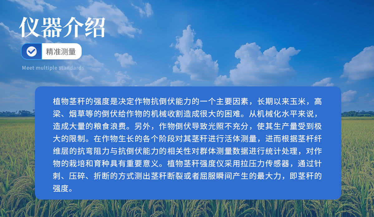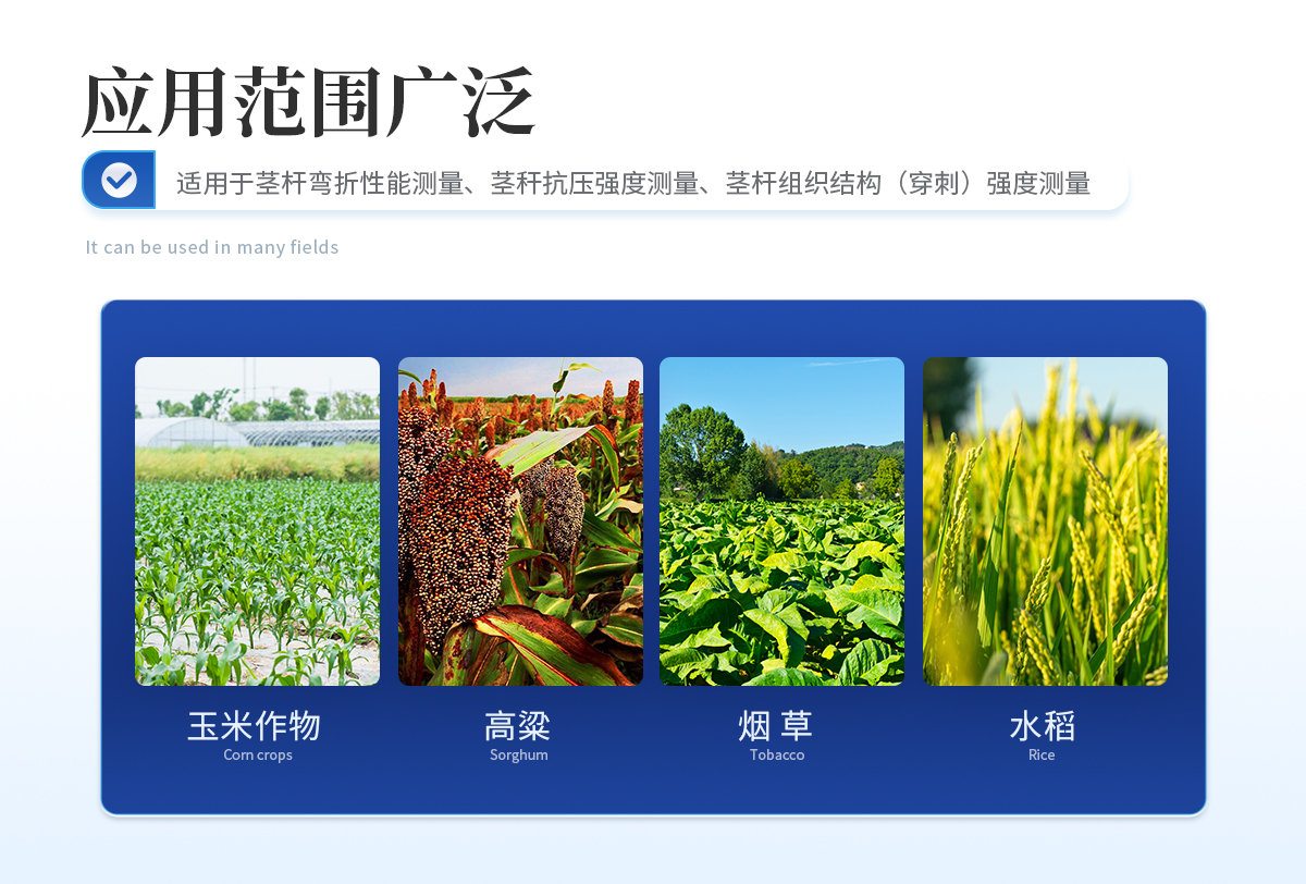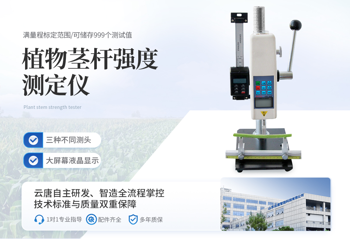 植物莖稈的強(qiáng)度是決定作物抗倒伏能力的一個主要因素,長期以來玉米,高梁、煙草等的倒伏給作物的機(jī)械收割造成很大的困難。從機(jī)械化水平來說,造成大量的糧食浪費(fèi)。另外,作物倒伏導(dǎo)致光照不充分,使其生產(chǎn)量受到極大的限制。在作物生長的各個階段對其莖稈進(jìn)行活體測量,進(jìn)而根據(jù)莖桿纖維層的抗彎阻力與抗倒伏能力的相關(guān)性對群體測量數(shù)據(jù)進(jìn)行統(tǒng)計(jì)處理,對作物的栽培和育種具有重要意義。植物莖稈強(qiáng)度儀采用拉壓力傳感器,通過針刺、壓碎、折斷的方式測出莖稈斷裂或者屈服瞬間產(chǎn)生的**力,即莖稈的強(qiáng)度。