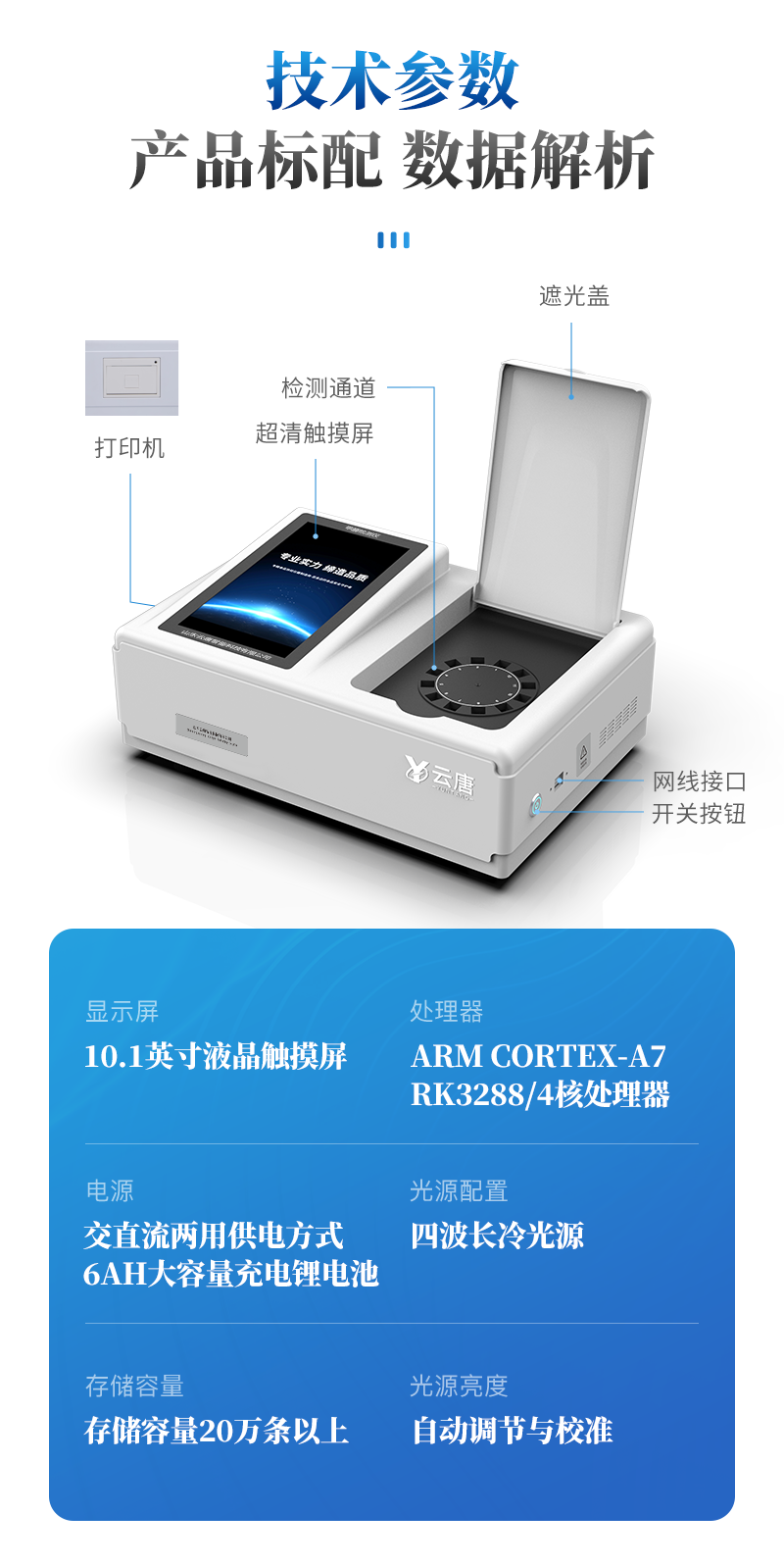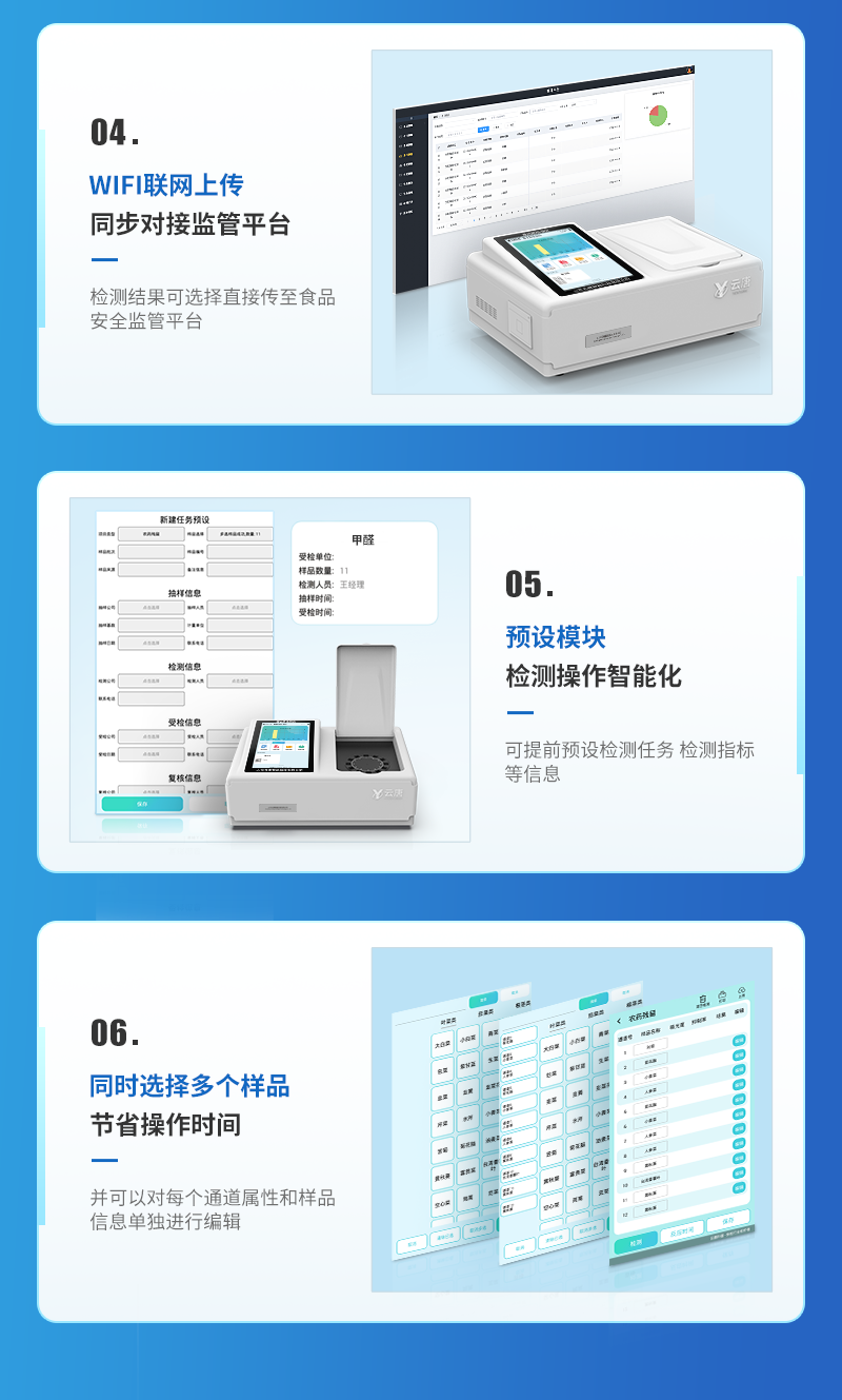 | 儀器采用臺式一體化系統檢測技術,將分光光度模塊、新型農殘檢測模塊、數字化管理模塊、無線通訊模塊高度集成于一體,支持檢測200種食品安全檢測項目,同時預留升級檢測方法。 | 儀器檢測模塊標準化、智能化,可隨意自由組合。檢測箱體內置多個標準檢測單元,檢測模塊可以調整配置。 | 儀器采用全新安卓智能系統,主控芯片采用 ARM Cortex-A7,RK3288/4核處理器,10.1寸高清液晶觸摸豎屏,更加**的UI交互界面,運轉快捷;儀器配備無線通信模塊: 4G(APN)通訊模塊、Wifi模塊,藍牙傳輸,同時具有雙USB接口以及RJ45接口能以多種方式實現數據保存和數據傳輸功能。 | 創新檢測模式: | ★檢測通道:≥12通道;采用精密旋轉比色池設計,使用同芯片同光源校準精度,解決不同光源之間的誤差值。1-12通道間誤差0.1%。(***:**202022821055.2) | ★儀器具有自動識別比色皿檢測功能,即:將樣品比色皿放入儀器后,點擊樣品檢測,儀器自動識別比色皿進行通道檢測。 | 進口高精光源: | 高精度進口四波長冷光源,通道配置 410、520、590、630nm 波長光源,一個光源芯片驅動一個光源,誤差極小,每臺設備單獨**校準光源,**比對,同時參照四種不同波段光源全方位覆蓋市面上99%的農殘食品項目檢測。 | 智能化操作系統: | 便捷操作系統:設備檢測時可在同一檢測界面自動對應相關檢測通道一次性選擇1-12個樣品名稱,無須退出界面,節省操作時間。 | 數據集成系統:設備首頁自動統計檢測數據包含:周檢測數據、月檢測數據,全部檢測總數量,均包含檢測總數,合格數,不合格數,以及相關柱形分析圖,對各項檢測數據清晰掌握,無需電腦查詢,更加快捷直觀。 | 項目預設系統:支持添加單個及多個相同或不相同的任務預設,一鍵快速調取,每一個任務分別可以設置不同的樣品、批次、編號、來源、備注、抽樣信息、檢測信息、受檢信息、復核信息等更多信息。無縫鏈接平臺和APP實時查看下發任務。 | 數據監管系統:同步對接監管平臺,數據可局域網和互聯網數據上傳,檢測結果可選擇直接傳至食品安全監管平臺。集成OSS輸出存儲服務、區分設備定向管理應用,進行區域食品安全監管及大數據分析處理與數據統計,檢測區域食品安全長短期動態,達到食品安全問題預估、預警。 | 自定義打印系統:內置全新打印系統,新創自定義打印方式,可按需靈活設置開啟或關閉:產品合格證(國家農業部標準要求),二維碼,抽樣信息、檢測信息,受檢信息、復核信息、抽樣日期、檢測日期等信息的打印。 | 系統遠程更新功能:可定向分客戶分儀器更新系統,按照不同客戶后期實際需求添加項目,無需機器返廠,即可遠程實時升級全新系統,節省時間成本及避免運輸造成設備損壞。 | 儀器主機采用一體化防水、抗壓、防撞擊、防腐蝕箱體設計,同時配備交直流供電,可連接車載電源,可選配大容量充電鋰電池,滿足現場野外檢測需求。 | 安全證書,放心保障:儀器具有中國計量科學研究院校準證書,權威認證。 |