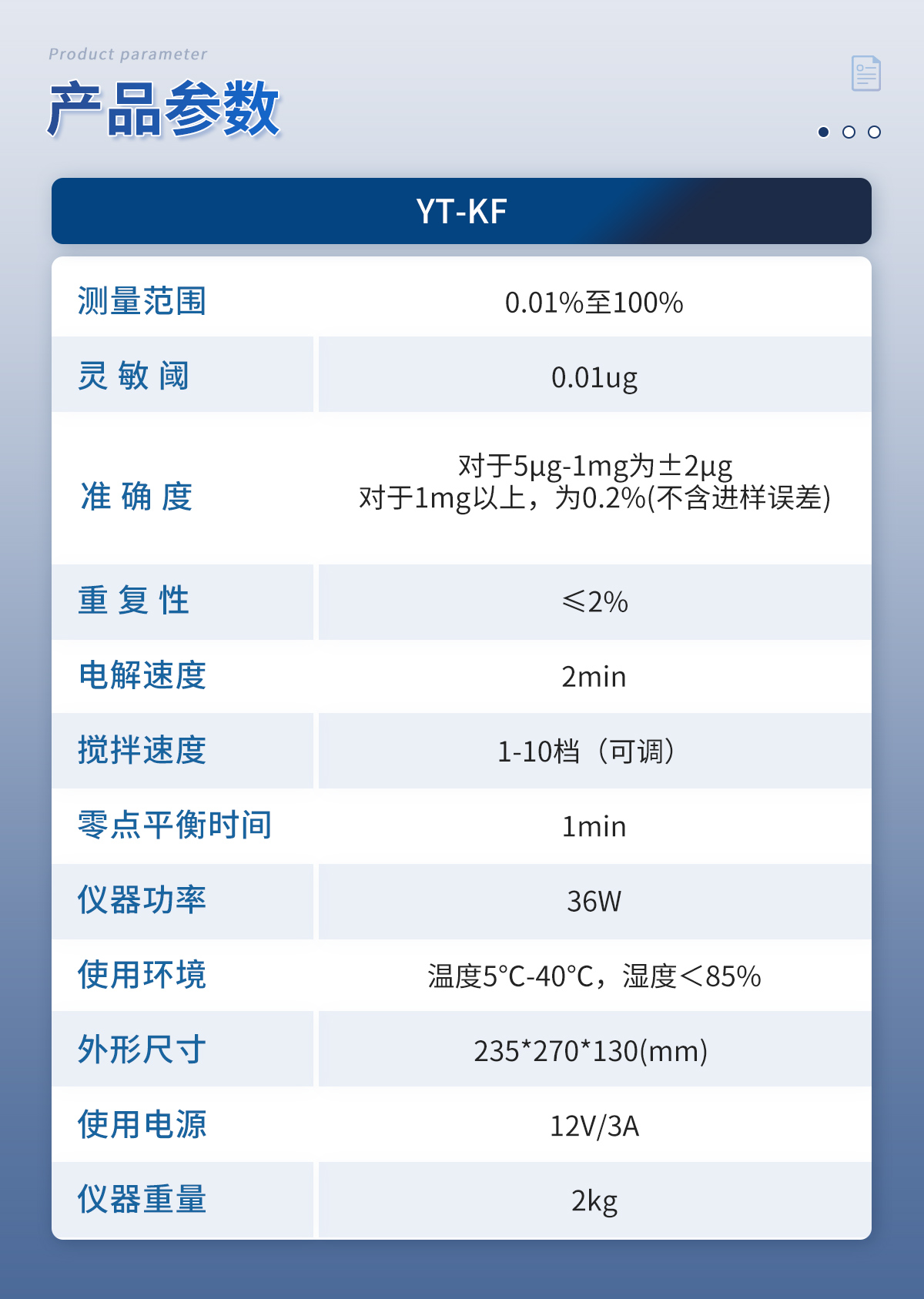 | 1.測量范圍:0.01%至100% | 2.靈 敏 閾:0.01ug | 3.準 確 度:對于5μg-1mg為±2μg,對于1mg以上,為0.2%(不含進樣誤差) | 4.重 復 性:≤2% | 5.電解速度:2min | 6.攪拌速度:1-10檔(可調) | 7.零點平衡時間:1min | 8.儀器功率:36W | 9.使用環境:溫度5℃-40℃,濕度<85% | 10.外形尺寸:235*270*130(mm) | 11.使用電源:12V/3A | 12.儀器重量:2kg |