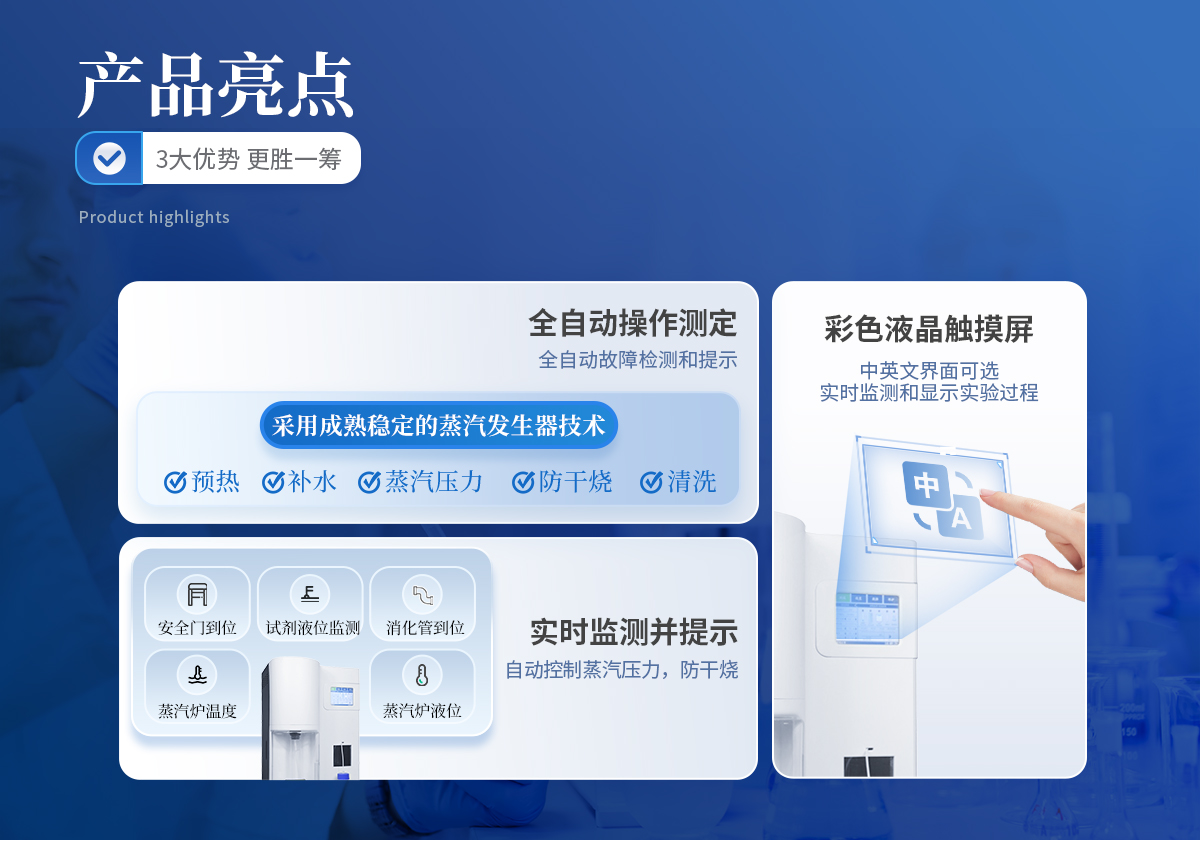 用于檢測食品、藥品、土壤、化工、農業、林業、材料、環境監測等領域氮含量或蛋白質含量測定、陽離子交換量測定。