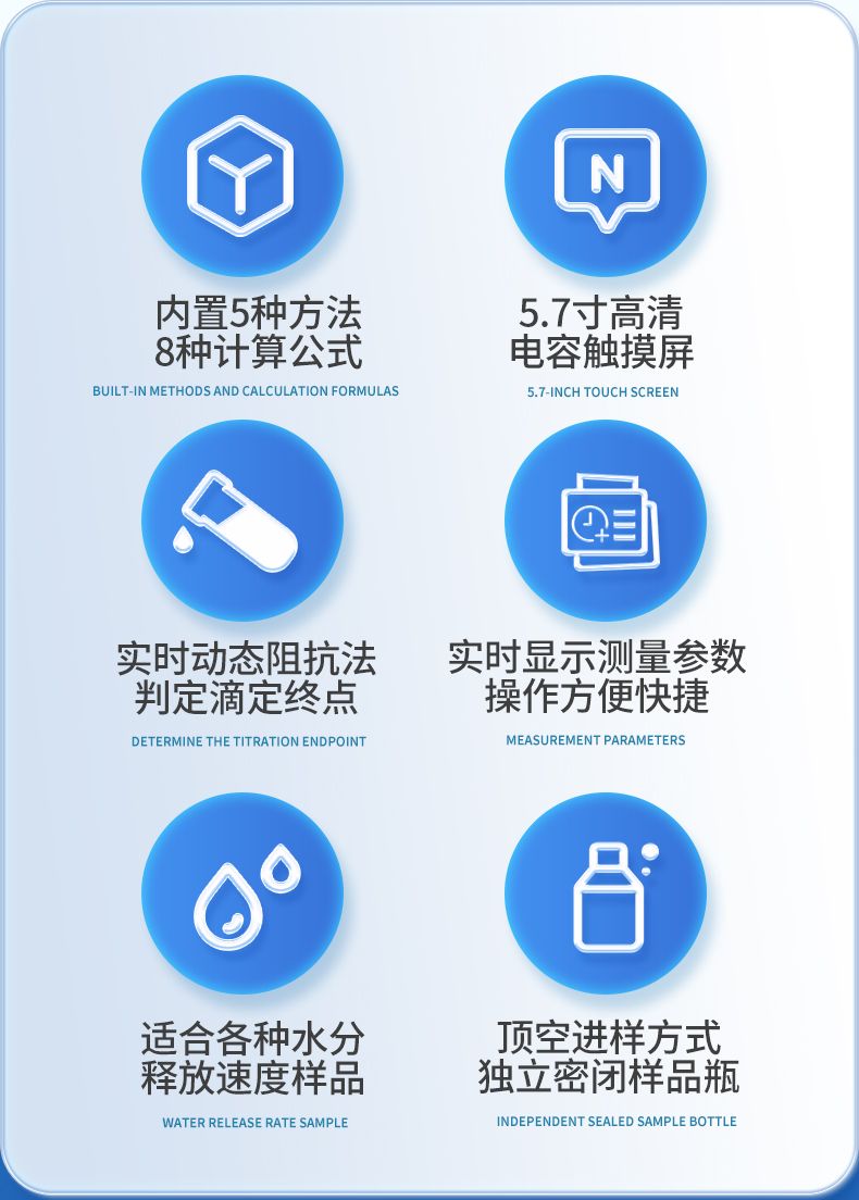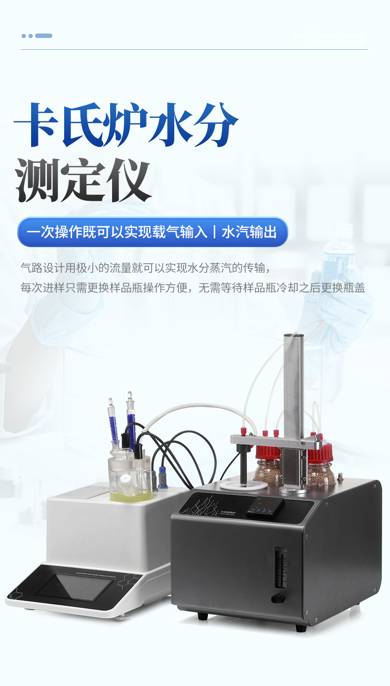 | 1. 采用高精度庫侖法水分測定儀與卡氏加熱爐聯用,**可以檢測到3μg水,精度達到ppm級; | 2. 空芯氣針進樣,和帶加熱功能的氣體輸送管路,零死體積水汽不凝結,操作更簡單,同時也很大的提高了儀器的準確性和重復性; | 3. 5.7寸高清電容觸摸屏,實時顯示測量參數,簡潔明了的功能菜單,全面的參數顯示,操作方便快捷 ; | 4. 內置5種方法可供選擇,8種計算公式方便各種樣品檢測,自定義樣品單位%、ppm、mg/kg等結果單位更加人性化; | 5. 系統實時檢測環境中的水分,精準扣除漂移,采用實時動態阻抗法判定滴定終點,測量結果更精準; | 6. **溫度300℃可以滿足大部分樣品檢測,氣流0-100ml可調,適合各種水分釋放速度的樣品; | 7. 操作方便,用戶只需要設置合適的溫度,合適的流量,把樣品放入事先準備好的樣品瓶,放入加熱器,然后把傳輸針扎入樣品瓶的硅膠墊,在儀器上點開始測量即可; | 8. 無需等待上一次樣品瓶冷卻之后才能進行下一次樣品測量,更換樣品瓶過程中樣品瓶始終保持密封狀態,測量效率更高更準確,尤其是吸濕性強的樣品無需擔心空氣中水分的干擾; | 9. 采用頂空進樣的方式,保證每個測定采用“新”的樣品瓶,樣品測定無交叉感染。樣品瓶體積小,確保較小的死體積和背景水分值。獨立密閉樣品瓶,測定時無需樣品轉移,結果更準確; | 10. 旋蓋式樣品瓶,無需專用且昂貴的壓蓋器和開蓋器,使用非常方便; | 11. 頂空進樣技術,只有氣體進入水分測定儀反應杯,不污染反應杯及電解電極。 |
