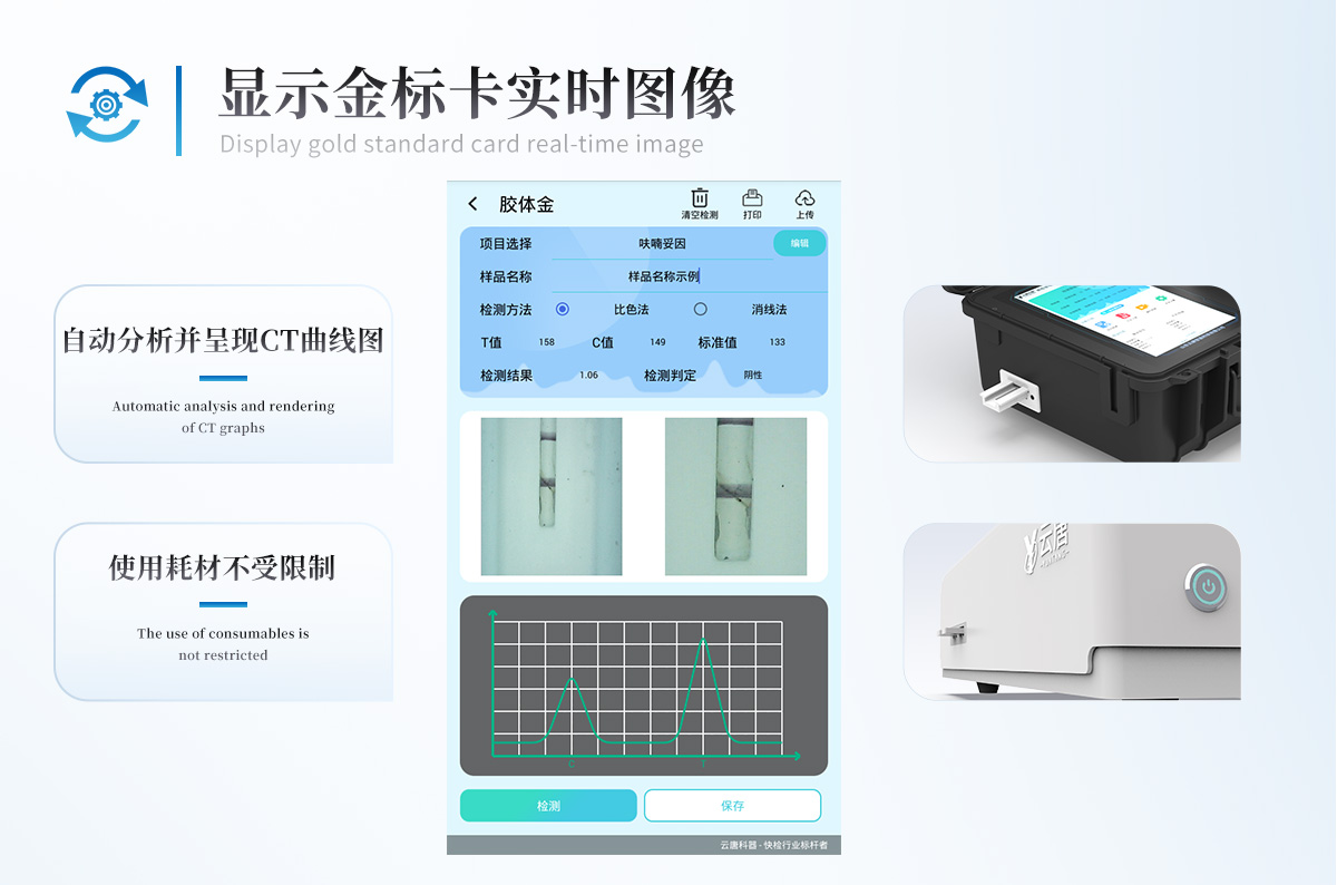 | 儀器采用10.1英寸液晶觸摸屏顯,搭配運(yùn)行安卓智能操作系統(tǒng),主控芯片采用ARM Cortex-A7,RK3288/4核處理器,主頻1.88Ghz,運(yùn)轉(zhuǎn)速度更快速,性能更強(qiáng)。 | 儀器功能包括:膠體金檢測(cè)模塊、數(shù)字化管理模塊、無(wú)線通訊模塊等,可以滿足同一軟件下實(shí)現(xiàn)所有檢測(cè)項(xiàng)目的檢測(cè),并在同一窗口展示檢測(cè)結(jié)果。 | 一體化便攜式快檢設(shè)備,采用交直流兩用供電方式,可連接車載電源,配備6ah大容量充電鋰電池,可以滿足現(xiàn)場(chǎng)及流動(dòng)檢測(cè)使用的需求。儀器尺寸:43×35×20cm, 主機(jī)凈重:5.1kg | 系統(tǒng)自帶數(shù)據(jù)集成模塊,設(shè)備首頁(yè)自動(dòng)統(tǒng)計(jì)檢測(cè)數(shù)據(jù)包含:周檢測(cè)數(shù)據(jù)、月檢測(cè)數(shù)據(jù),全部檢測(cè)總數(shù)量,均包含檢測(cè)總數(shù),合格數(shù),不合格數(shù),以及相關(guān)柱形分析圖,對(duì)各項(xiàng)檢測(cè)數(shù)據(jù)清晰掌握,無(wú)需電腦查詢,更加快捷直觀。 | 儀器具有任務(wù)預(yù)設(shè)模塊,可在樣品送檢前提前預(yù)設(shè)樣品名稱、檢測(cè)指標(biāo)、送檢單位等信息,樣品送檢時(shí)一鍵調(diào)取保存信息,檢測(cè)更加方便快捷。 | 軌道式自動(dòng)傳輸掃描方式,可實(shí)時(shí)顯示金標(biāo)卡實(shí)時(shí)圖像,系統(tǒng)自動(dòng)分析并呈現(xiàn)出CT曲線圖,CT線自動(dòng)識(shí)別,無(wú)需手動(dòng)調(diào)整,完成檢測(cè)后自動(dòng)退出檢測(cè)卡。 | 結(jié)果判定線可修改,對(duì)照值標(biāo)定值可保存,斷電不丟失數(shù)據(jù)。 | 兼容市場(chǎng)上其他膠體金卡,使用耗材不受限制,極大增強(qiáng)用戶使用體驗(yàn)。 | 儀器檢測(cè)系統(tǒng)擁有龐大數(shù)據(jù)庫(kù),并且構(gòu)建了完善的檢索、修訂功能。食品庫(kù)涵蓋多種樣品名稱,可按需添加或刪除、編輯樣品名稱;產(chǎn)品數(shù)據(jù)庫(kù)以及歷史檢測(cè)記錄支持一鍵檢索功能。 | 系統(tǒng)打印自定義化,打印格式多樣化,產(chǎn)品合格證(****要求),二維碼,抽樣信息、檢測(cè)信息,受檢信息、復(fù)核信息、抽樣日期、檢測(cè)日期等信息結(jié)果,可按需求自行設(shè)置打印內(nèi)容。 | A4紙版本報(bào)告打印功能(可選配):設(shè)備擁有兩種結(jié)果展示方式,可以自動(dòng)生成A4打印模板和小票打印模板兩種樣式,可通過(guò)WiFi及網(wǎng)線等方式鏈接外置打印機(jī)可進(jìn)行打印 | 儀器具有 wifi 聯(lián)網(wǎng)上傳、RJ45網(wǎng)線連接功能,可以快速上傳數(shù)據(jù)。同步對(duì)接監(jiān)管平臺(tái),數(shù)據(jù)可局域網(wǎng)和互聯(lián)網(wǎng)數(shù)據(jù)上傳,檢測(cè)結(jié)果直接傳至食品安全監(jiān)管平臺(tái)。進(jìn)行區(qū)域食品安全監(jiān)管及大數(shù)據(jù)分析處理與數(shù)據(jù)統(tǒng)計(jì),檢測(cè)區(qū)域食品安全長(zhǎng)短期動(dòng)態(tài),達(dá)到食品安全問(wèn)題預(yù)估、預(yù)警。 | 設(shè)備支持U盤存儲(chǔ),標(biāo)準(zhǔn)USB接口,免驅(qū)動(dòng)安裝。檢測(cè)結(jié)果存儲(chǔ)容量20萬(wàn)條以上,可生成Excel表格,進(jìn)行一鍵拷貝,并具有登錄保護(hù)功能,可設(shè)置用戶名及密碼,規(guī)范不同人員操作權(quán)限,防止非工作人員操作,并且可以進(jìn)行重新校準(zhǔn)、鎖定、恢復(fù)出廠設(shè)置功能。儀器固件可升級(jí),后期檢測(cè)項(xiàng)目可擴(kuò)充。 | 儀器具有重新校準(zhǔn)、鎖定、恢復(fù)出廠設(shè)置功能。 | 儀器具備遠(yuǎn)程升級(jí)功能,可定向分客戶分儀器更新,開(kāi)機(jī)后自動(dòng)更新,并可持續(xù)性免費(fèi)更新系統(tǒng)版本,無(wú)需像傳統(tǒng)產(chǎn)品返廠更新,節(jié)省時(shí)間及人力成本并避免了物流運(yùn)輸返廠升級(jí)導(dǎo)致設(shè)備損壞的潛在風(fēng)險(xiǎn)。 |