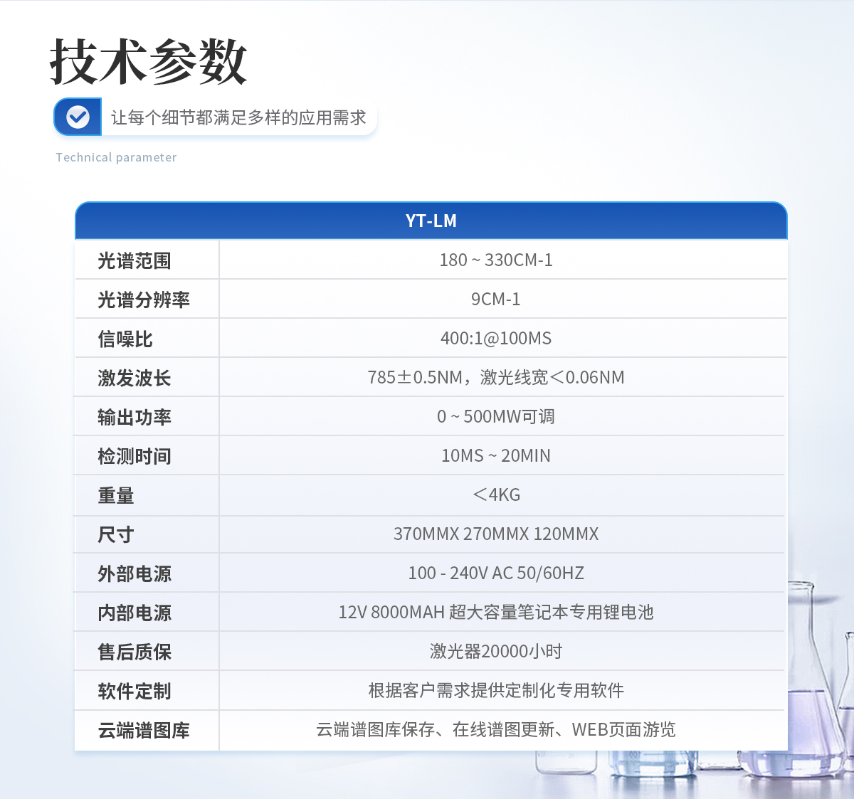 | 規格:YT-LM標準版 | 光譜范圍:180 ~ 3300cm-1 | 光譜分辨率:9cm-1 | 信噪比:400:1@100ms | 激發波長:785+0.5nm,激光線寬< 0.06 nm | 輸出功率:0~ 500mW可調 | 檢測時間:10ms ~ 20min | 重量:<4kg | 尺寸:370mmx 270mmx 120mm | 外部電源:100-240V AC 50/60Hz | 內部電源:12V 8000mAH 超大容量筆記本專用鋰電池 | 售后質保:激光器20000小時 | 軟件定制:根據客戶需求提供定制化專用軟件 | 云端譜圖庫:支持云端譜圖保存、 在線譜圖更新、WEB 頁面瀏覽 |
