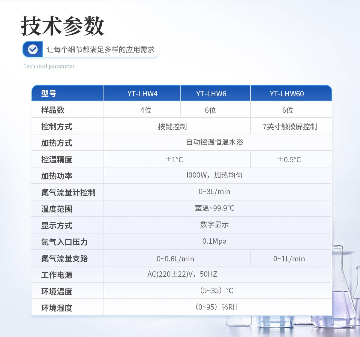 | 1、大容量反應瓶,可同時處理多個樣品。 | 2、鹽酸口、氣體進口、出口三口一體且相互獨立,操作會不干擾。 | 3、恒溫水浴加熱,具有快速自動恒溫控制系統,加熱溫度可以手動設定。 | 4、由升降位置固定旋鈕調節樣品架及配氣系統的升降旋轉樣品架,正面安裝樣品,操作方便。 | 5、每個樣品的氮氣流量獨立控制調節或關閉,針閥氣體流量計準確控制和顯示氣體總消耗量。 |