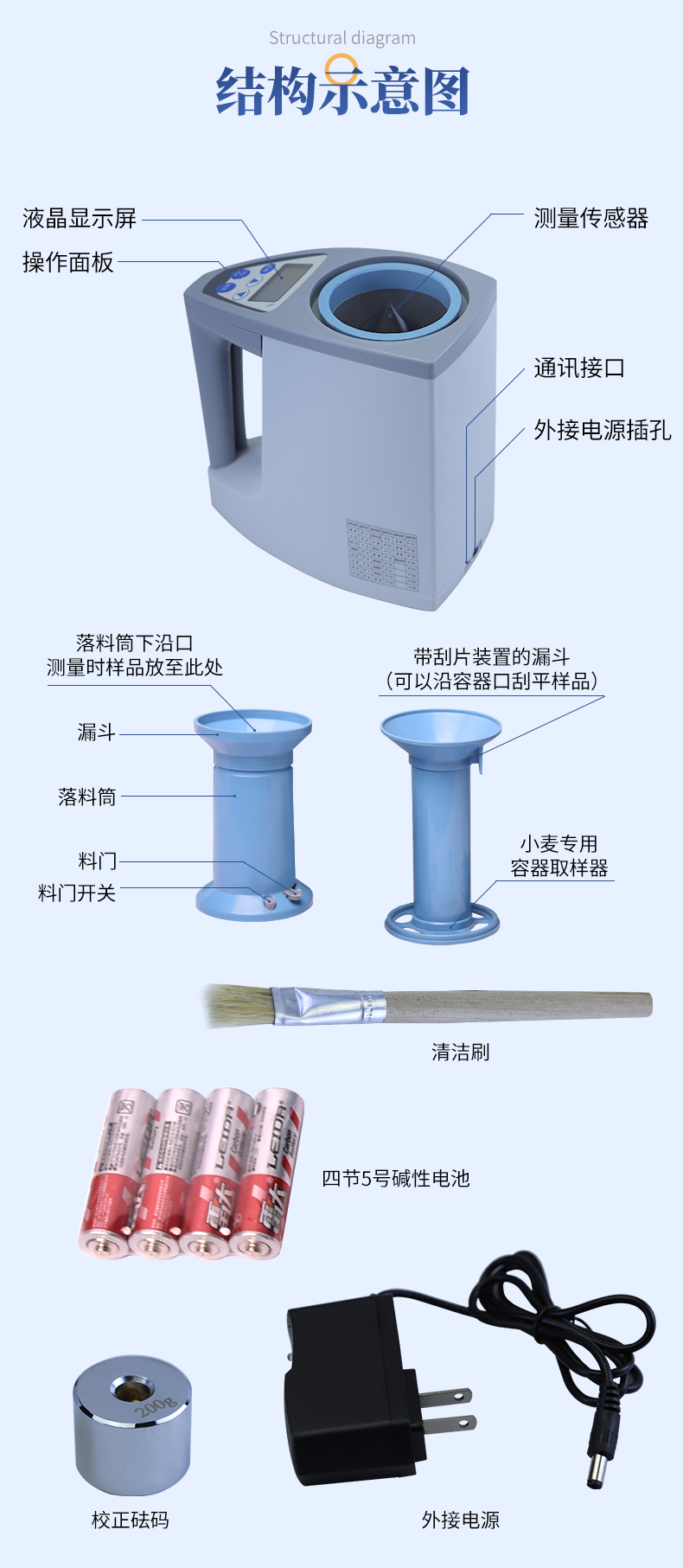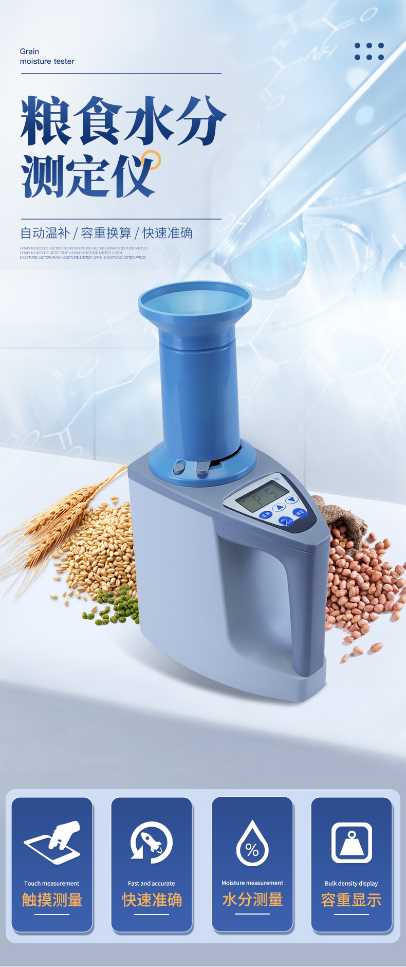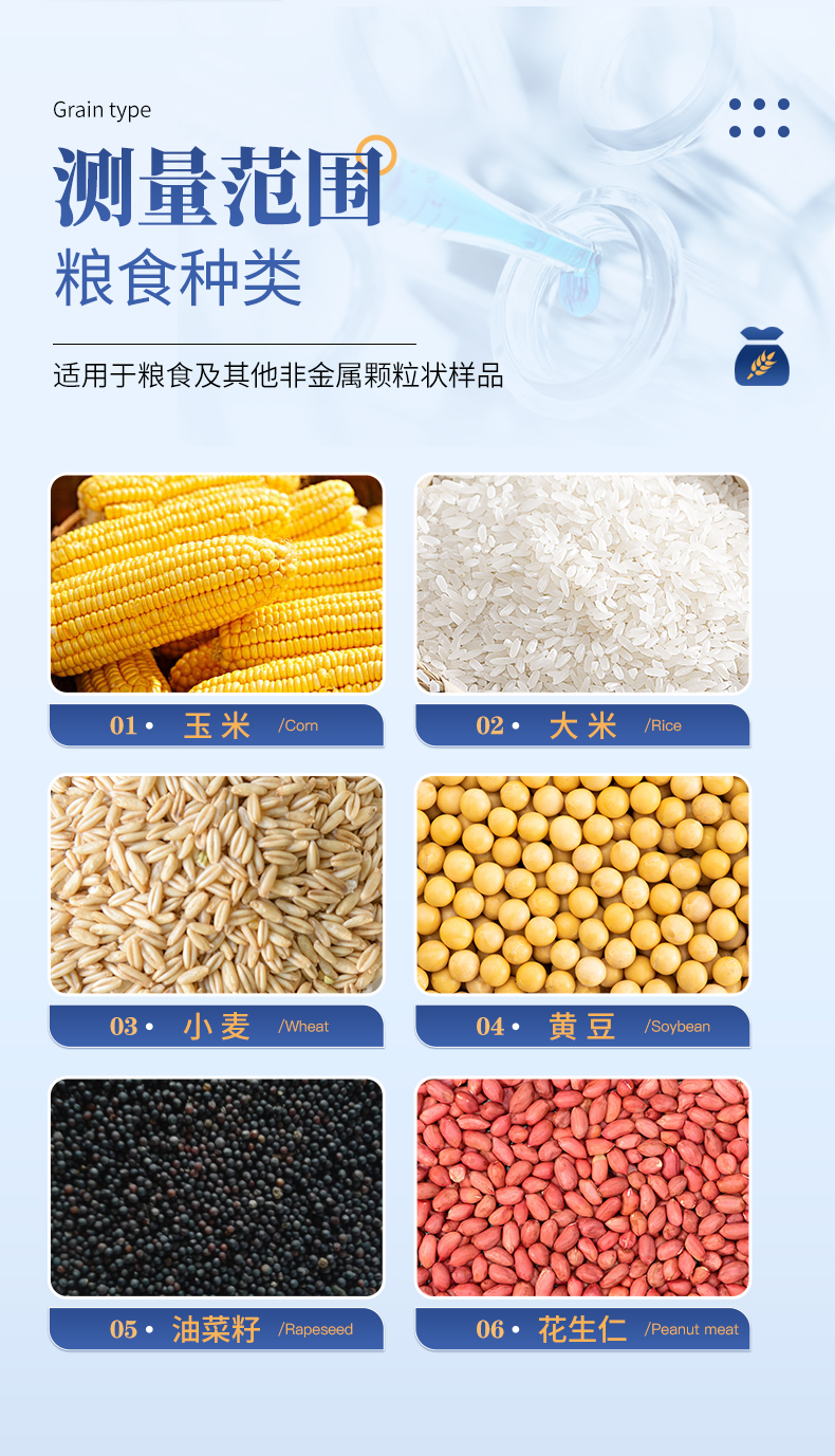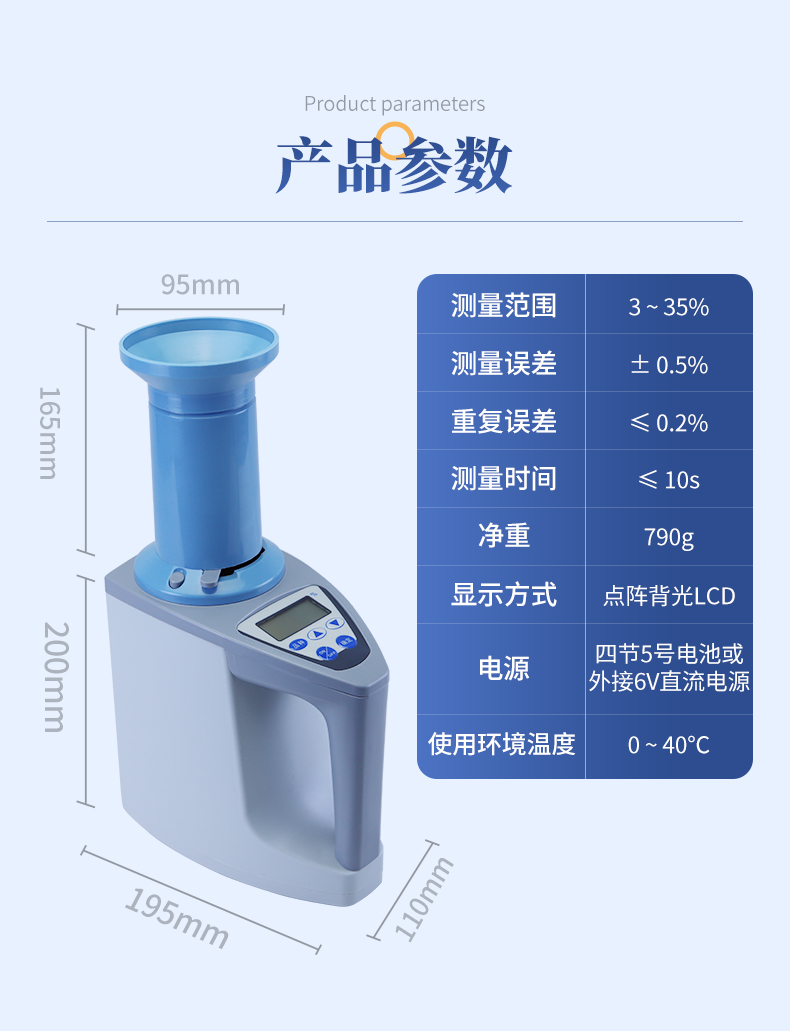 | 容重換算:獨特的專利容重取樣裝置在**測量小麥的同時,可以直接換算出小麥容重指標。 | 測量范圍:可測量谷類、玉米、東北玉米、大麥、小麥、白小麥、大米、豆粕、花生仁、菜粕、高粱、黑芝麻、棉籽、棉粕、秈谷、大豆、油菜籽、飼料、蔬菜種子等非金屬顆粒狀物質。 | 快速準確:數秒內即可顯示結果,測量誤差≤±0.5℅ | 操作簡單:20個常見品種已預先定標,不需秤樣、用料簡取樣后可立即測量水分 | 水分測量范圍:3-35℅ | 使用環境溫度:0~40℃ | 溫度補償:自動 | 定 標:浮動四點定標,品種不限(常見品種20個已預先定標,可直接測量) | 工作電源,直流6V(5號干電池四節) | 自動關機:超過三分鐘無操作自動關機。 | 便攜方便:重約1千克、外型小巧、電源交直流二用,適合各種工作場合 | 適合國情:用戶可對本地特殊品種采用本機獨創的四點定標法自行定標,自行修正水分值 | 高性價比:技術含量高,性能**而價格相比同類產品較低。 |