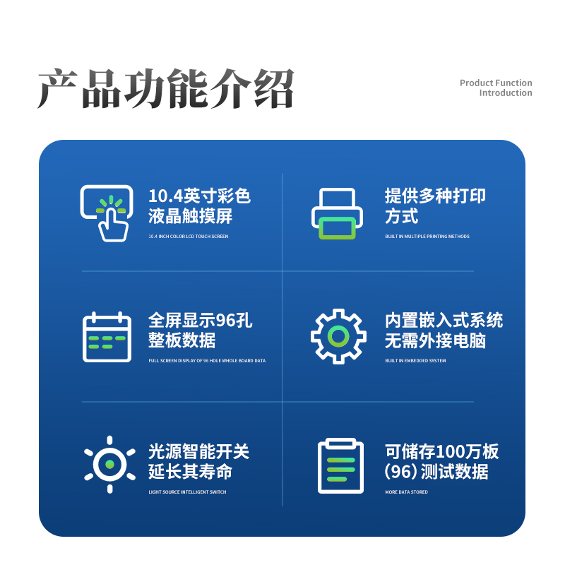 產品特點: 10.4英寸彩色液晶觸摸屏輸入,大屏顯示,操作快捷; 全屏顯示96孔可視化布板操作界面; 自動儲存標準曲線,用戶可對標準曲線進行修正;