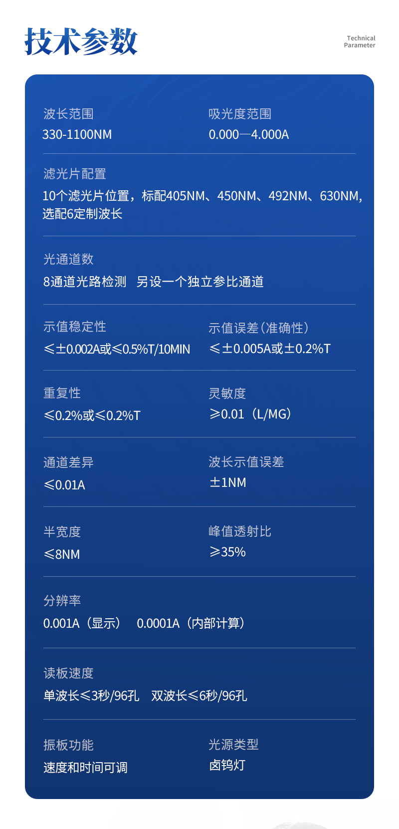 | 波長范圍: 330-1100nm | 濾光片配置:10個濾光片位置,標配405nm、450nm、492nm、630nm,選配6定制波長 | 吸光度范圍:0.000―4.000A | 光通道數:8通道光路檢測,另設一個獨立參比通道 | 示值穩定性:≤±0.002A或≤0.5%T/10min | 示值誤差(準確性):≤±0.005A或±0.2%T | 重復性:≤0.2%或≤0.2%T | 靈敏度:≥0.01(L/mg) | 通道差異:≤0.01A | 波長示值誤差:±1nm | 半寬度:≤8nm | 峰值透射比:≥35% | 分辨率:0.001A(顯示),0.0001A(內部計算) | 讀板速度:單波長≤3秒/96孔,雙波長≤6秒/96孔 | 振板功能:速度和時間可調 | 光源類型:鹵鎢燈 | 板條類型:標準96孔或其他型酶標板、條 | 適用孔型:平底、U型和V型 | 顯示方式:10.4英寸彩色液晶顯示屏顯示 | 輸入方式:觸摸屏輸入,可選配鼠標和鍵盤 | 打印:內置熱敏打印機,可外接打印機 | 接 口:DVI口、VGA口、網口、USB口、音頻孔、RS232串口 | 使用環境:溫度5-40℃;濕度15%-80% | 電源電壓:220V±10%,50/60Hz | 體積:470mm×350mm×210mm(長×寬×高) | 重量:11.5Kg |