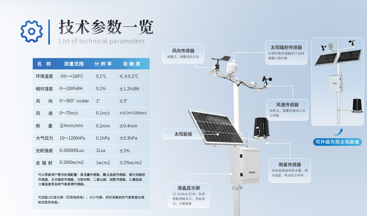 | 可以根據用戶需求拓展配置:露點溫度傳感器、紫外線輻射傳感器、光合有效輻射傳感器等各種氣象要素傳感器。 | 可加裝LED顯示屏(交流電供電),大小可調,實時采集到的氣象數據及其他設定的信息。 |