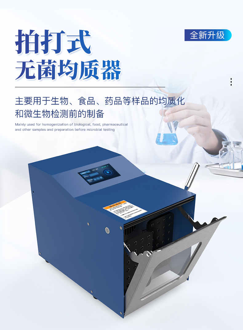 拍打式均質器(Stomacher Blender)是一種常用于實驗室樣品前處理的設備,主要用于生物、食品、藥品等樣品的均質化和微生物檢測前的制備。