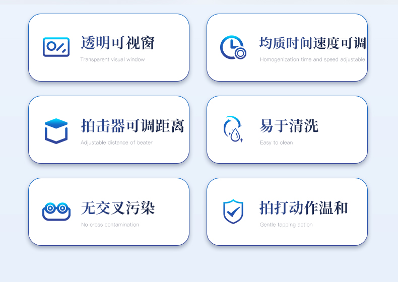 | 1. 拍打動作溫和,避免過度破碎,適合微生物檢測。 | 2. 使用一次性無菌袋,無交叉污染。 | 3. 均質時間、拍打速度可調。 | 4. 可儲存九組工作程序,一鍵操作。 | 5. 拍擊器可調整前后距離。 | 6. 全開啟式門,易于清洗。 | 7. 帶有透明可視窗,方便觀察樣品均質效果。 | 8. 開門停機,確保安全。 |