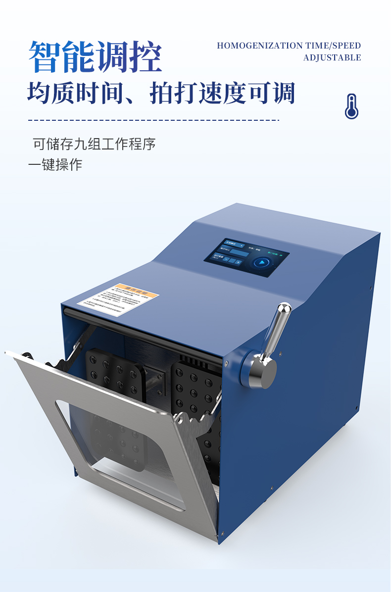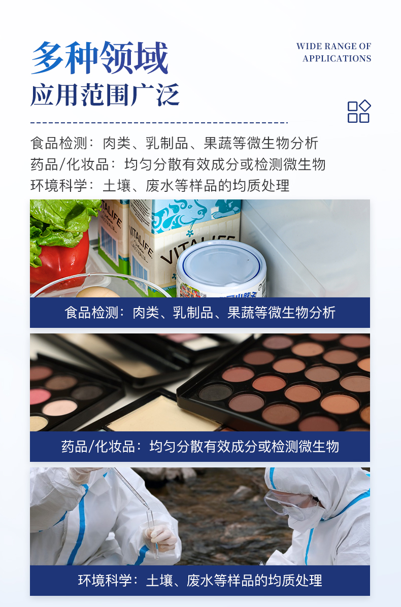 | 食品檢測:肉類、乳制品、果蔬等微生物分析。 | 藥品/化妝品:均勻分散有效成分或檢測微生物。 | 環境科學:土壤、廢水等樣品的均質處理。 |