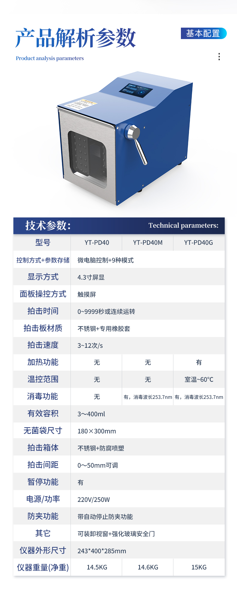 產品概述: 拍打式均質器(Stomacher Blender)是一種常用于實驗室樣品前處理的設備,主要用于生物、食品、藥品等樣品的均質化和微生物檢測前的制備。 應用范圍: 食品檢測:肉類、乳制品、果蔬···