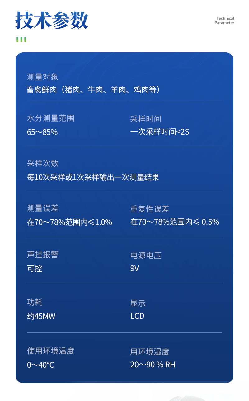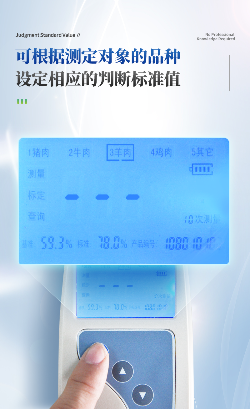 | 畜禽鮮肉(豬肉、牛肉、羊肉、雞肉等) | 65~85% | 一次采樣時間< 1s | 每10次采樣或1次采樣輸出一次測量結果 | 在70~78%范圍內≤1.0% | 在70~78%范圍內≤ 0.5% | 超標報警 | 可設定每個品種的判斷標準。 | 交直流兩用 | 觸摸式按鍵 | 45mW | 167×70×30mm | 藍色背光LCD | 0~40℃ | 20~90 % RH | USB接口 |