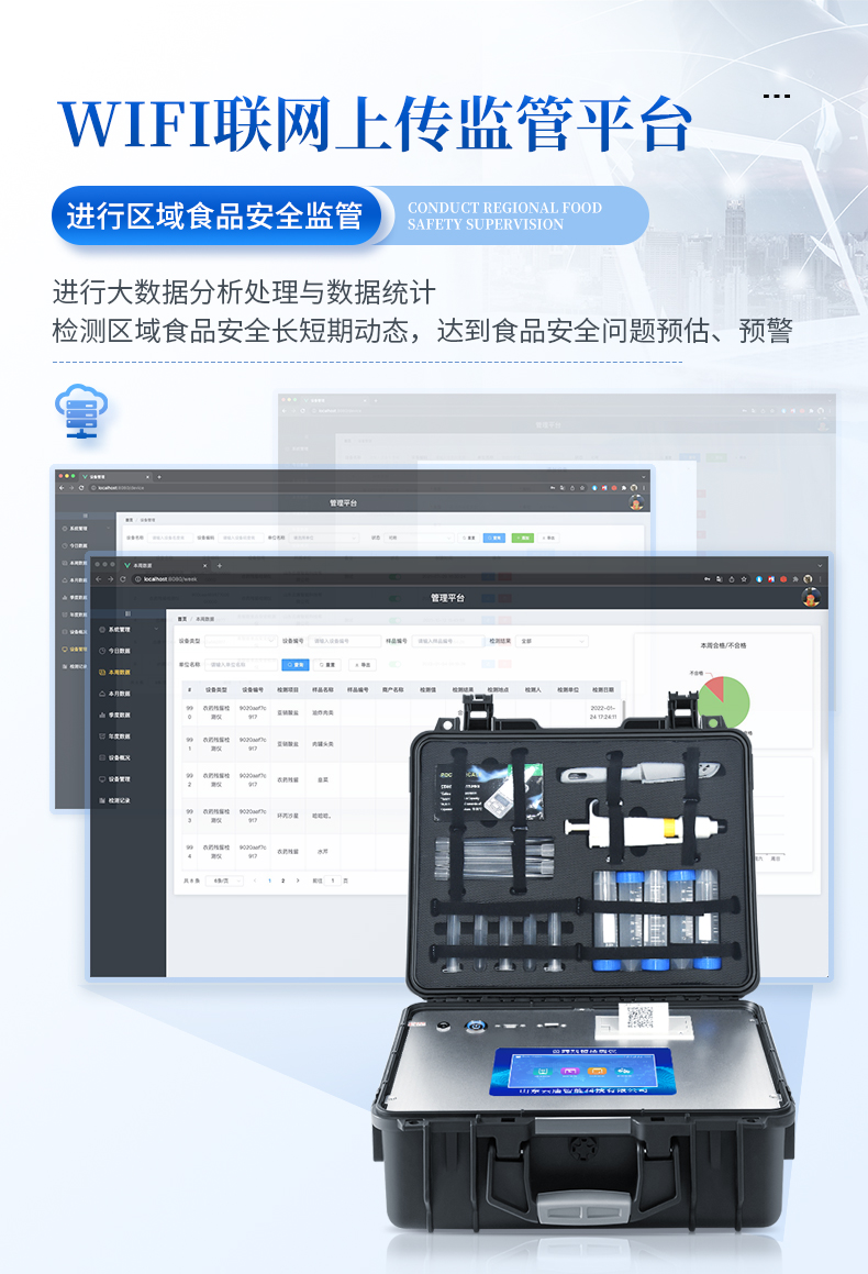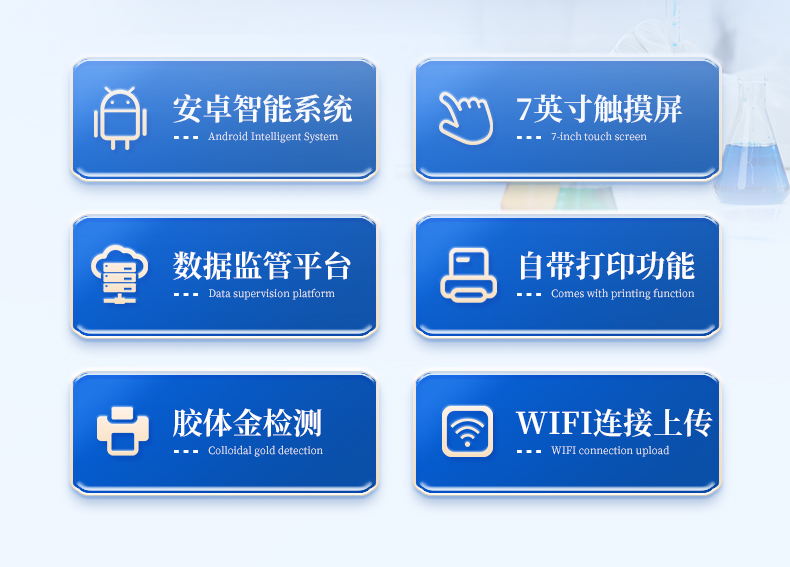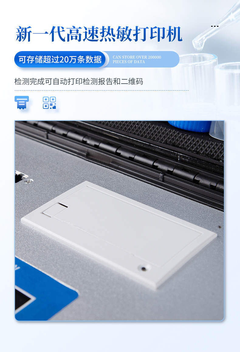 | 安卓智能操作系統,采用更加**和人性化操作,儀器具有網線連接、wifi聯網上傳、4G無線遠傳功能,快速上傳數據。 | 智能化程度高,儀器具有自檢功能:具有開機自檢和調零功能,具有自動檢測重復性功能。 | 新一代高速熱敏打印機,檢測完成可自動打印檢測報告和二維碼。 | 儀器帶有監管平臺,數據可局域網和互聯網數據上傳,檢測結果直接傳至食品安全監管平臺。進行區域食品安全監管及大數據分析處理與數據統計,檢測區域食品安全長短期動態,達到食品安全問題預估、預警 | 一體化便攜式快檢設備,滿足現場及流動檢測使用需求,能夠在同一軟件下實現所有檢測項目的檢測,并可通過同一窗口直觀顯示檢測結果。 | 膠體金模塊檢測方式:軌道式自動傳輸掃描,檢測完成后自動退出檢測卡。 | CT線自動識別,無需手動調整。 | 儀器具有品類多種類樣品菜單庫,可靈活選擇檢測樣品,不同的檢測通道可同時檢測不同的樣品項目。 | 樣品處理簡單省力,整體操作快速、安全、便捷。 | 儀器具有自身保護功能,可設置用戶名及密碼,防止非工作人員操作等。 | 高靈敏度,高檢測精度,高重復性精度,掃描式高精度光學傳感器。 | 內置強大的數據庫,可在儀器上直接選擇樣品名稱、檢測指標、送檢單位等信息,也可在儀器上直接編輯錄入樣品名稱、檢測指標、送檢單位等信息并保存進樣品數據庫。 | 儀器具有重新校準、鎖定、恢復出廠設置功能。 | 結果判定線可修改,對照值標定值可保存,斷電不丟失數據。 | 兼容市場上所有的膠體金卡,使用耗材不受限制,極大增強用戶使用體驗。 |