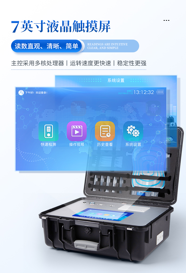 | 主控芯片采用ARM Cortex-A7,RK3288/4核處理器,主頻1.88Ghz,運轉速度更快速,穩定性更強。 | 顯示方式:7英寸液晶觸摸屏顯示,人性化中文操作界面,讀數直觀、簡單。 | 交直流兩用,直流12V供電,可連接車載電源,可配6ah大容量充電鋰電池,方便戶外流動測試。 | 光源亮度自動調節與校準 | 智能恒流穩壓,光強自動校準,長時間連續工作光源無溫漂現象。 | 內置新國家限量標準,與所測結果進行現場比對,并持續更新標準。 | 不間斷進樣,連續檢測 | 樣本編號自動累加。 | 檢測項目可擴充。 | 檢測結果可批量打印,批量上傳。 | 檢測結果為Excel表格,連接電腦即可拷貝。 | 檢測結果存儲容量20萬條 | 標準USB接口,免驅動安裝。 | 固件可升級 |