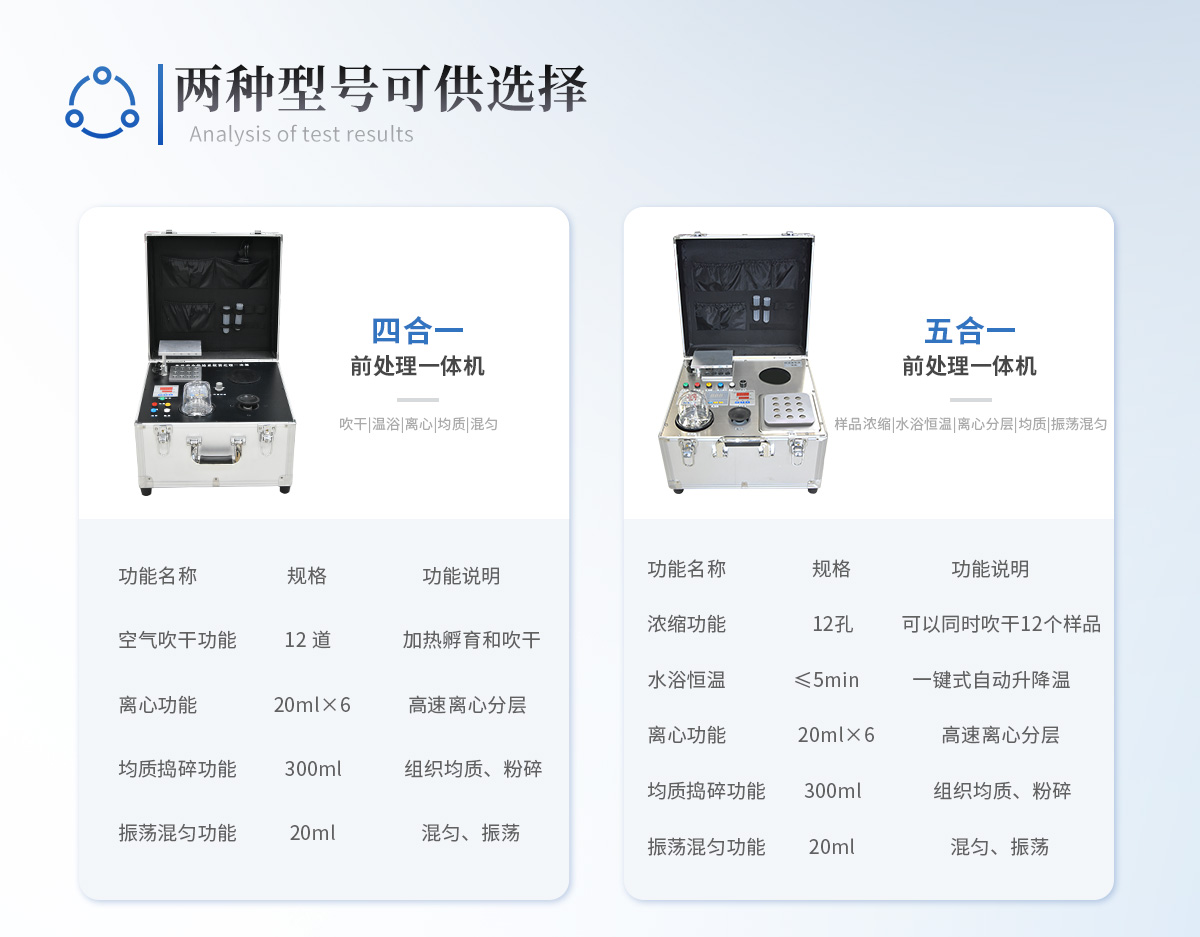 本公司應國內用戶的實際需求,自行研制開發的新型儀器——YT-HQC05型樣品前處理一體機。樣品前處理一體機將樣本前處理過程中樣品濃縮、離心分層、均質、振蕩混勻、水浴等步驟所需設備進行集成,僅需一臺設備即可完成所有樣本前處理過程,并且方便攜帶,不僅適用于現場檢測使用,還可用于色譜、質譜等分析樣品的純化和制備。