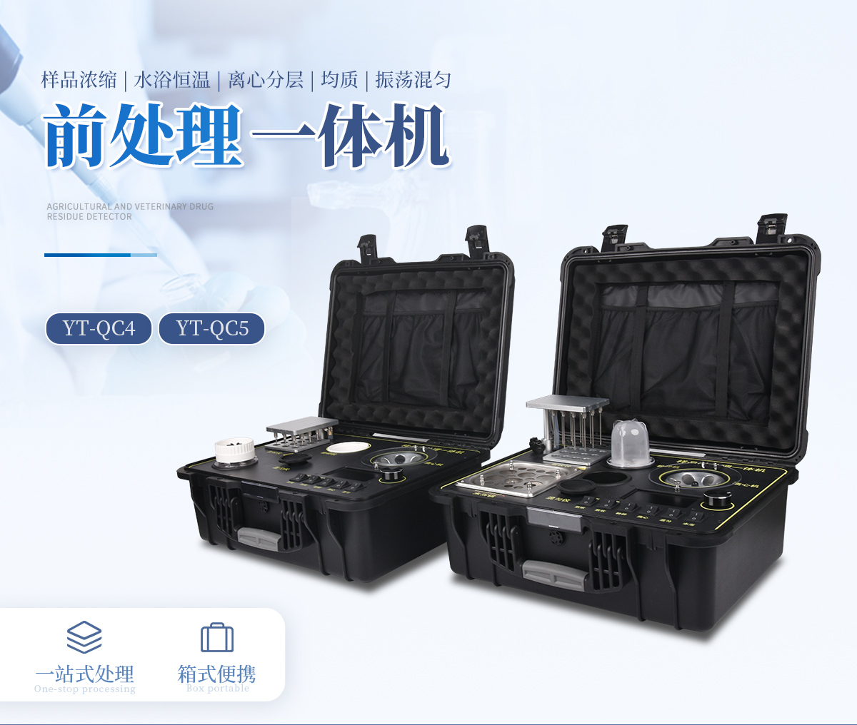 QC4型四合一樣品檢測前處理一體機(箱)是集吹干、離心、均質、混勻功能的一體化整合,極大的簡化和集中樣品前處理的一般操作過程,結合移動便攜的工程塑料箱體,特別適合農獸藥殘留畜禽水產品質量安全現場快速檢測。