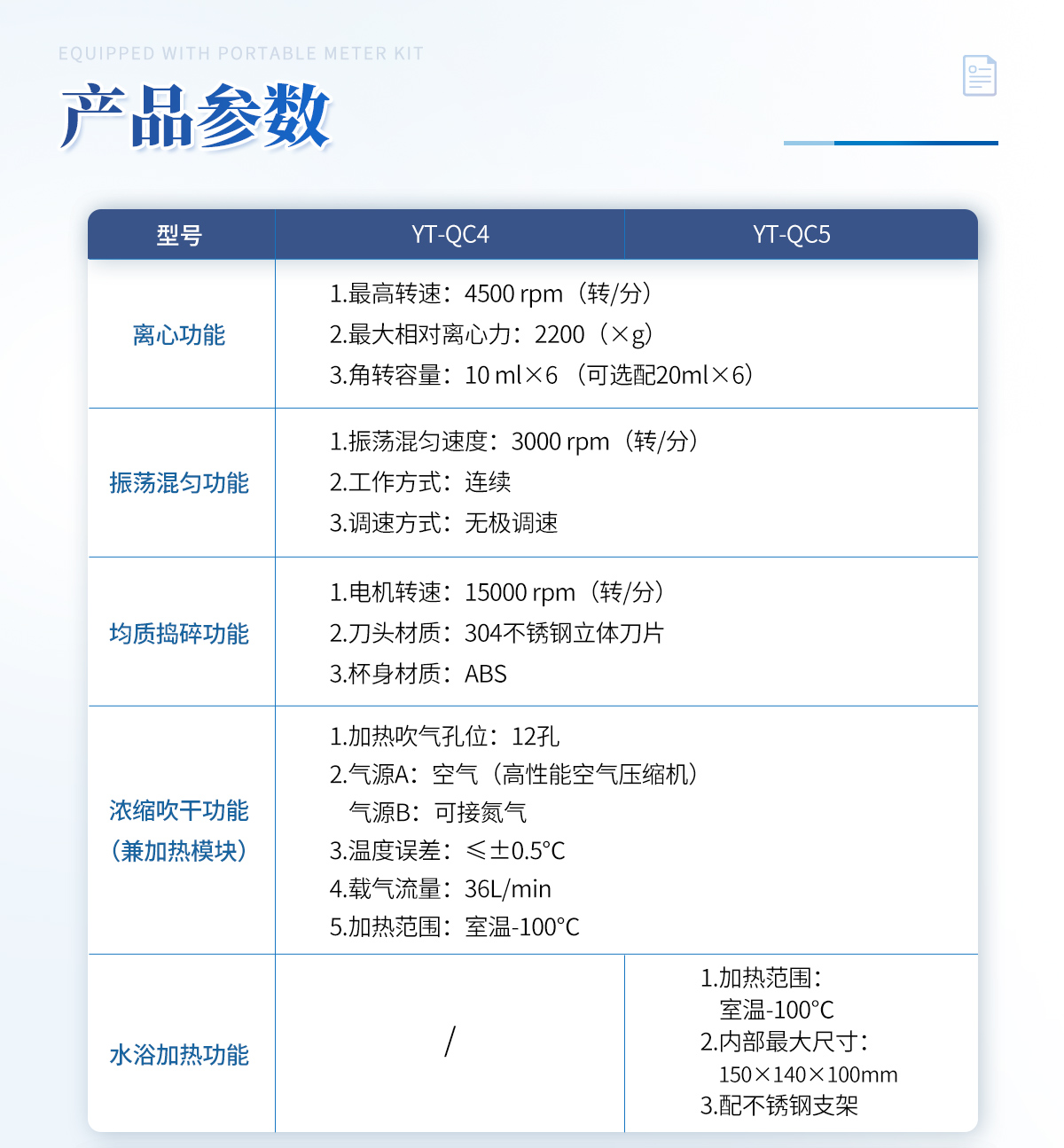 | 離心功能 1.**轉速:4500 rpm(轉/分) 2.**相對離心力:2200(×g) 3.角轉容量:10 mlx6 (可選配20mlx6) | 振蕩混勻功能 1.振蕩混勻速度:3000 rpm(轉/分) 2.工作方式:連續 3.調速方式:無極調速 | 均質搗碎功能 1.電機轉速:15000 rpm(轉/分) 2.刀頭材質:304不銹鋼立體刀片 3.杯身材質:ABS | 濃縮吹干功能(兼加熱模塊) 1.加熱吹氣孔位: 12孔 2.氣源A: 空氣(高性能空氣壓縮機) 氣源B: 可接氮氣 3.溫度誤差:≤±0.5℃ 4.載氣流量:36L/min 5.加熱范圍:室溫-100℃ |