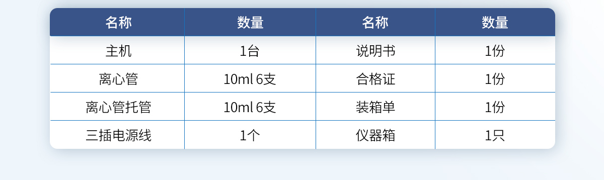 | 主機 1 臺 | 10ml離心管 6 支 | 10ml離心管托管 6 支 | 三插電源線 1 個 | 說明書 1 份 | 合格證 1 份 | 裝箱單 1 份 | 儀器箱 1只 |