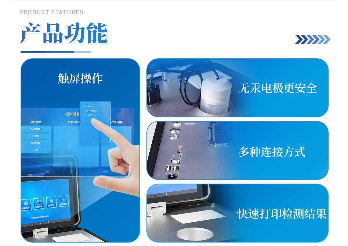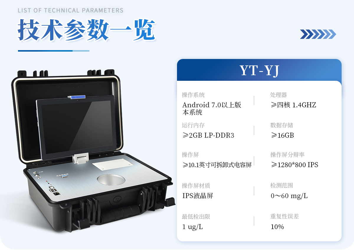 | 基本概述:便攜式箱體化一體機,采用防水、抗壓、防撞擊、防腐蝕箱體設計,滿足車載環境、無電源環境以及戶外檢測需求; | 主機:具備檢測功能、輔助功能、管理系統軟件、信息化管理功能,信息化實現數據雙向傳輸,能直接接收管理中心下發任務,并實時上報檢測結果至管理平臺; | 檢測技術:采用陽極溶出伏安法檢測技術; | 操作系統:Android 7.0以上版本系統; | 處理器:≥四核 1.4GHZ; | 運行內存:≥2GB LP-DDR3; | 數據存儲:≥16GB; | 通訊接口:包含兩個USB接口、網線接口、WIFI、藍牙、4G模塊,內置GPS接口,用于戶外或者其他移動檢測定位; | 指示燈:具有熱敏打印機工作指示燈,用于提示打印機工作狀態;具有電源充電指示燈,用于提示儀器充電狀態;具有無線藍牙對接狀態提示燈,用于提示操作平臺與儀器主機連接狀態;具有儀器工作狀態提示燈,用于提示儀器主機是否處于工作狀態; | 操作屏:≥10.1英寸可拆卸式電容屏設計,操作屏可以固定在儀器上,也可以取出單獨操作實現運程控制; | 操作屏分辯率:≥1280*800 IPS; | 操作屏材質: IPS液晶屏; | 輸入方式:電容屏、觸摸輸入、支持多點觸控; | 采用無汞電極,安全無毒; | 模塊自帶攪拌功能,啟動后既可自動攪拌溶液。 | 檢測范圍:0~60 mg/L ,**檢出限:1 ug/L; | 重復性誤差:10%; | 具有自動尋峰功能,計算出樣品**數據; | 內置線性掃描、常規脈沖掃描、微分脈沖掃描; | 儀器現場取證功能:儀器具有800萬以上防抖、自動對焦高清攝像頭,對檢測實樣進行現場拍照取證; | 電源控制器:雙電源控制器,節省電量; | 運程控制:支持20米內無線藍牙控制儀器檢測,方便使用者沒在儀器身邊時也能完成項目檢測; | 打印:內置微型熱敏打印機,可隨時打印檢測結果; | 電池:內置大容量可充電鋰電池,可連續工作5小時以上; | 箱體: 便攜一體化手提箱,箱體能防水,抗壓,整機重量<5kg,攜帶方便; |