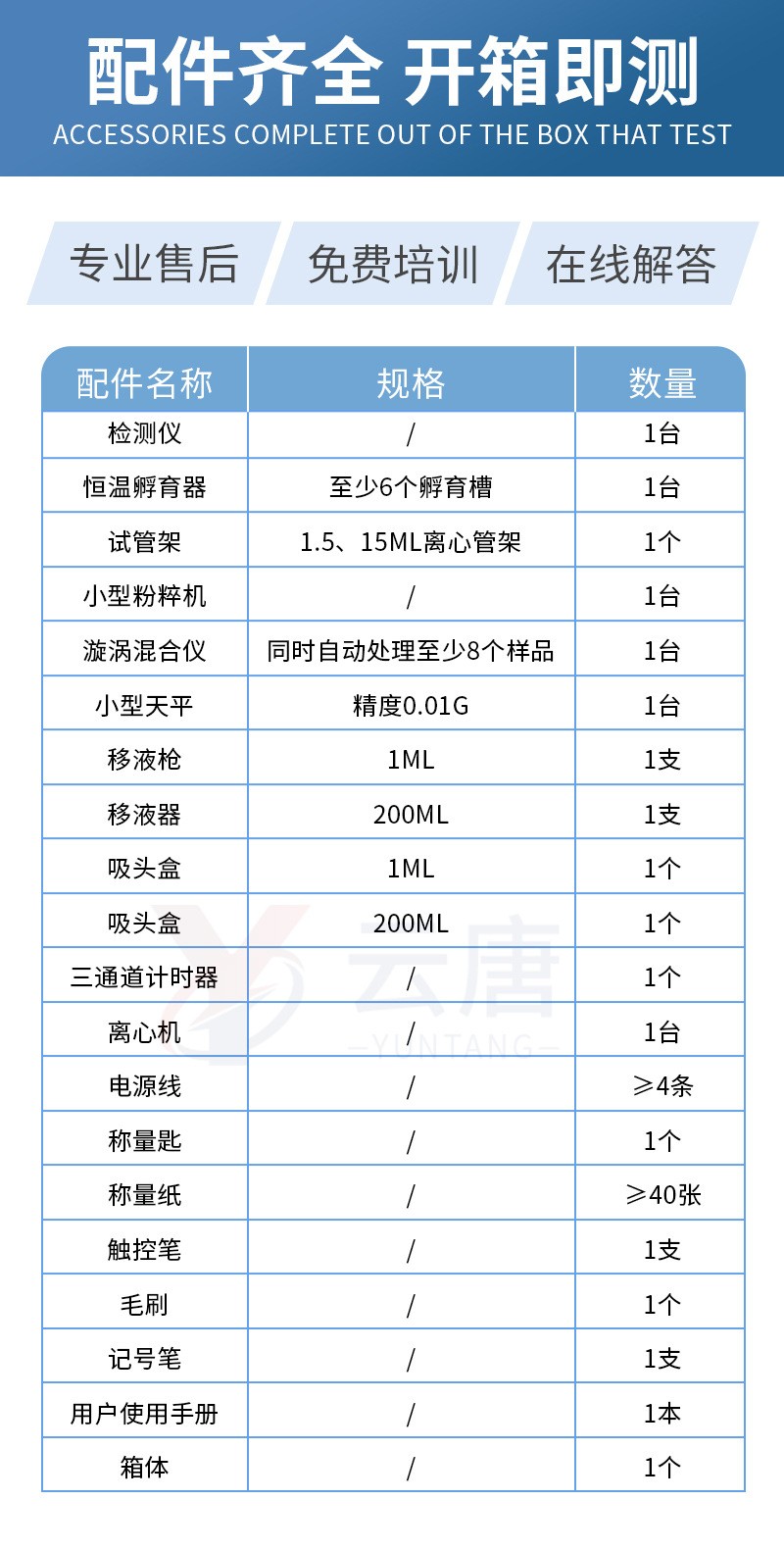 | (1)鋁合金箱體,便于攜帶及田間操作,快檢箱重量:小于18kg,抗震防水、拉桿式便攜; | (2)質保:產品驗收后1年內(主要設備檢測儀及恒溫孵育器3年內)予以免費維修或更換,保修期滿后提供終身維修服務; | (3)售后:提供一次免費上門培訓、在線解答、48小時內現場服務。 |