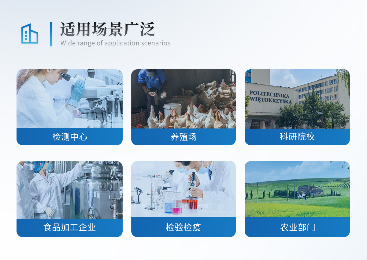 獸藥殘留檢測儀為集成化食品安全快速檢測分析設備,目前已于食藥監局、衛生部門、高教院校、科研院所、農業部門、養殖場、屠宰場、食品肉產品深加工企業及檢驗檢疫部門等單位廣泛使用。