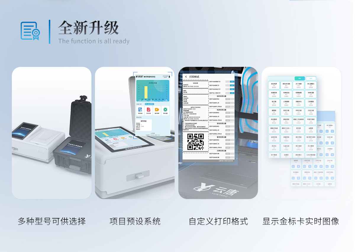 | 儀器采用10.1英寸液晶觸摸屏顯,搭配運行安卓智能操作系統(tǒng),主控芯片采用ARM Cortex-A7,RK3288/4核處理器,主頻1.88Ghz,運轉(zhuǎn)速度更快速,性能更強。 | 儀器功能包括:膠體金檢測模塊、數(shù)字化管理模塊、無線通訊模塊等,可以滿足同一軟件下實現(xiàn)所有檢測項目的檢測,并在同一窗口展示檢測結(jié)果。 | 一體化臺式快檢設(shè)備,采用交直流兩用供電方式,可連接車載電源,配備6ah大容量充電鋰電池,可以滿足現(xiàn)場及流動檢測使用的需求。儀器尺寸:43×35×20cm, 主機凈重:5.1kg | 系統(tǒng)自帶數(shù)據(jù)集成模塊,設(shè)備首頁自動統(tǒng)計檢測數(shù)據(jù)包含:周檢測數(shù)據(jù)、月檢測數(shù)據(jù),全部檢測總數(shù)量,均包含檢測總數(shù),合格數(shù),不合格數(shù),以及相關(guān)柱形分析圖,對各項檢測數(shù)據(jù)清晰掌握,無需電腦查詢,更加快捷直觀。 | 儀器具有任務(wù)預(yù)設(shè)模塊,可在樣品送檢前提前預(yù)設(shè)樣品名稱、檢測指標、送檢單位等信息,樣品送檢時一鍵調(diào)取保存信息,檢測更加方便快捷。 | 直插式自動掃描方式,可實時顯示金標卡實時圖像,系統(tǒng)自動分析并呈現(xiàn)出CT曲線圖,CT線自動識別,無需手動調(diào)整,完成檢測后自動退出檢測卡。 | 結(jié)果判定線可修改,對照值標定值可保存,斷電不丟失數(shù)據(jù)。 | 兼容市場上其他膠體金卡,使用耗材不受限制,極大增強用戶使用體驗。 | 儀器檢測系統(tǒng)擁有龐大數(shù)據(jù)庫,并且構(gòu)建了完善的檢索、修訂功能。食品庫涵蓋多種樣品名稱,可按需添加或刪除、編輯樣品名稱;產(chǎn)品數(shù)據(jù)庫以及歷史檢測記錄支持一鍵檢索功能。 | 系統(tǒng)打印自定義化,打印格式多樣化,產(chǎn)品合格證(****要求),二維碼,抽樣信息、檢測信息,受檢信息、復(fù)核信息、抽樣日期、檢測日期等信息結(jié)果,可按需求自行設(shè)置打印內(nèi)容。 | A4紙版本報告打印功能(可選配):設(shè)備擁有兩種結(jié)果展示方式,可以自動生成A4打印模板和小票打印模板兩種樣式,可通過WiFi及網(wǎng)線等方式鏈接外置打印機可進行打印 | 儀器具有 wifi 聯(lián)網(wǎng)上傳、RJ45網(wǎng)線連接功能,可以快速上傳數(shù)據(jù)。同步對接監(jiān)管平臺,數(shù)據(jù)可局域網(wǎng)和互聯(lián)網(wǎng)數(shù)據(jù)上傳,檢測結(jié)果直接傳至食品安全監(jiān)管平臺。進行區(qū)域食品安全監(jiān)管及大數(shù)據(jù)分析處理與數(shù)據(jù)統(tǒng)計,檢測區(qū)域食品安全長短期動態(tài),達到食品安全問題預(yù)估、預(yù)警。 | 設(shè)備支持U盤存儲,標準USB接口,免驅(qū)動安裝。檢測結(jié)果存儲容量20萬條以上,可生成Excel表格,進行一鍵拷貝,并具有登錄保護功能,可設(shè)置用戶名及密碼,規(guī)范不同人員操作權(quán)限,防止非工作人員操作,并且可以進行重新校準、鎖定、恢復(fù)出廠設(shè)置功能。儀器固件可升級,后期檢測項目可擴充。 | 儀器具備遠程升級功能,可定向分客戶分儀器更新,開機后自動更新,并可持續(xù)性免費更新系統(tǒng)版本,無需像傳統(tǒng)產(chǎn)品返廠更新,節(jié)省時間及人力成本并避免了物流運輸返廠升級導(dǎo)致設(shè)備損壞的潛在風險。 |
